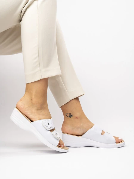 Klapki na koturnie z ozdobnym haftem i klamrami w kolorze Black