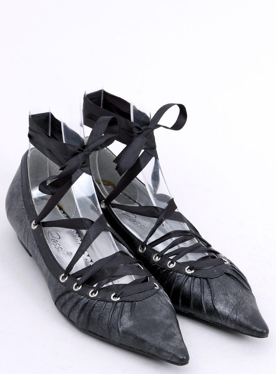 Eleganckie czółenko balerinki z noskiem w szpic. Buciki bardzo zgrabnie i ślicznie wyglądają na nodze. Mają atłasową wstążkę do zawiązania na kostce. Są bardzo oryginalne i niepowtarzalne. Model wykonany ze skóry ekologicznej w lekko metalicznym wykończeniu.