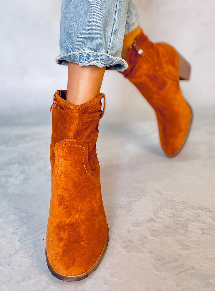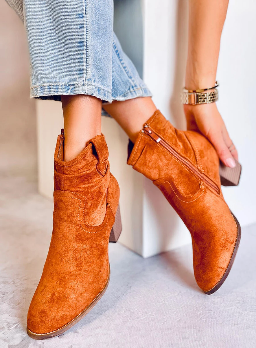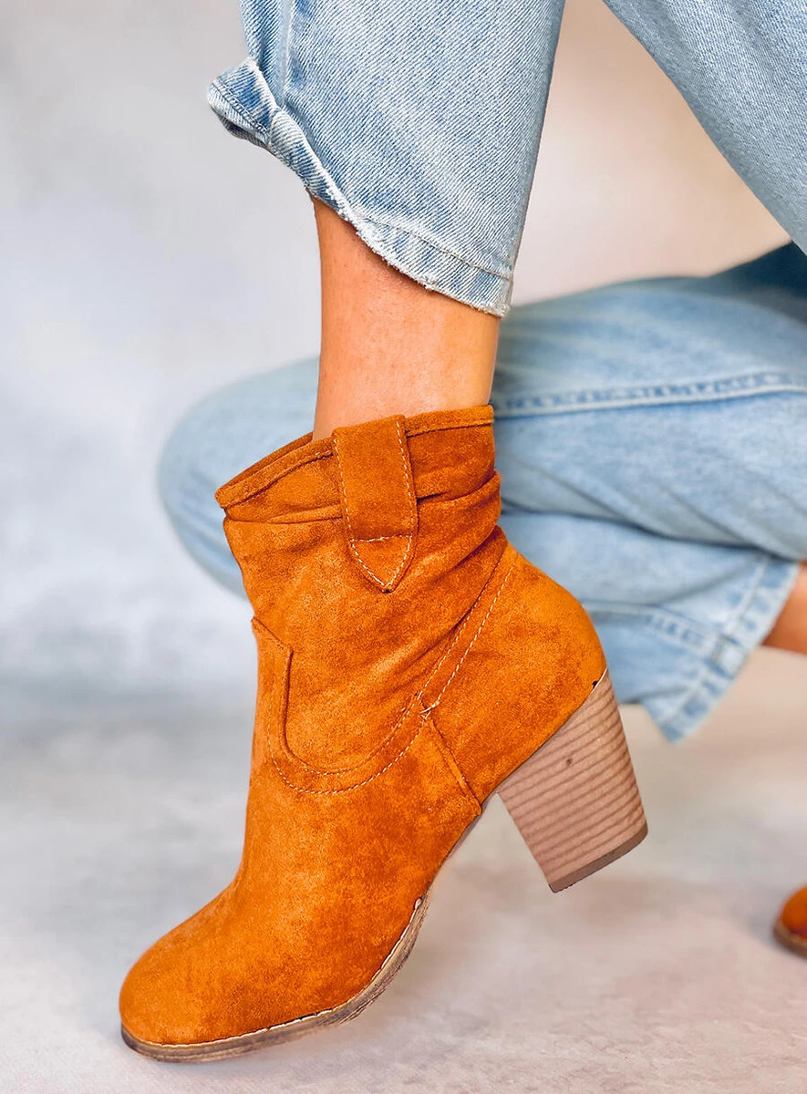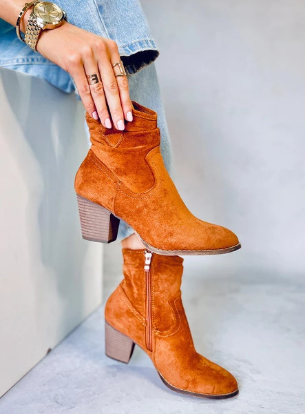 Zamszowe botki damskie na stabilnym obcasie o wysokości 6,5 cm. Model o kroju kowbojek z modnie marszczoną cholewką to absolutny must have tego sezonu! Daj im szansę podbić swoją garderobę : ) Mają praktyczne zapięcie na zamek błyskawiczny z boku, które zapewnia komfortowe zakładanie. Wykonane są z bardzo miłego w dotyku zamszu ekologicznego, a wnętrze wyścielone jest delikatnym futerkiem.