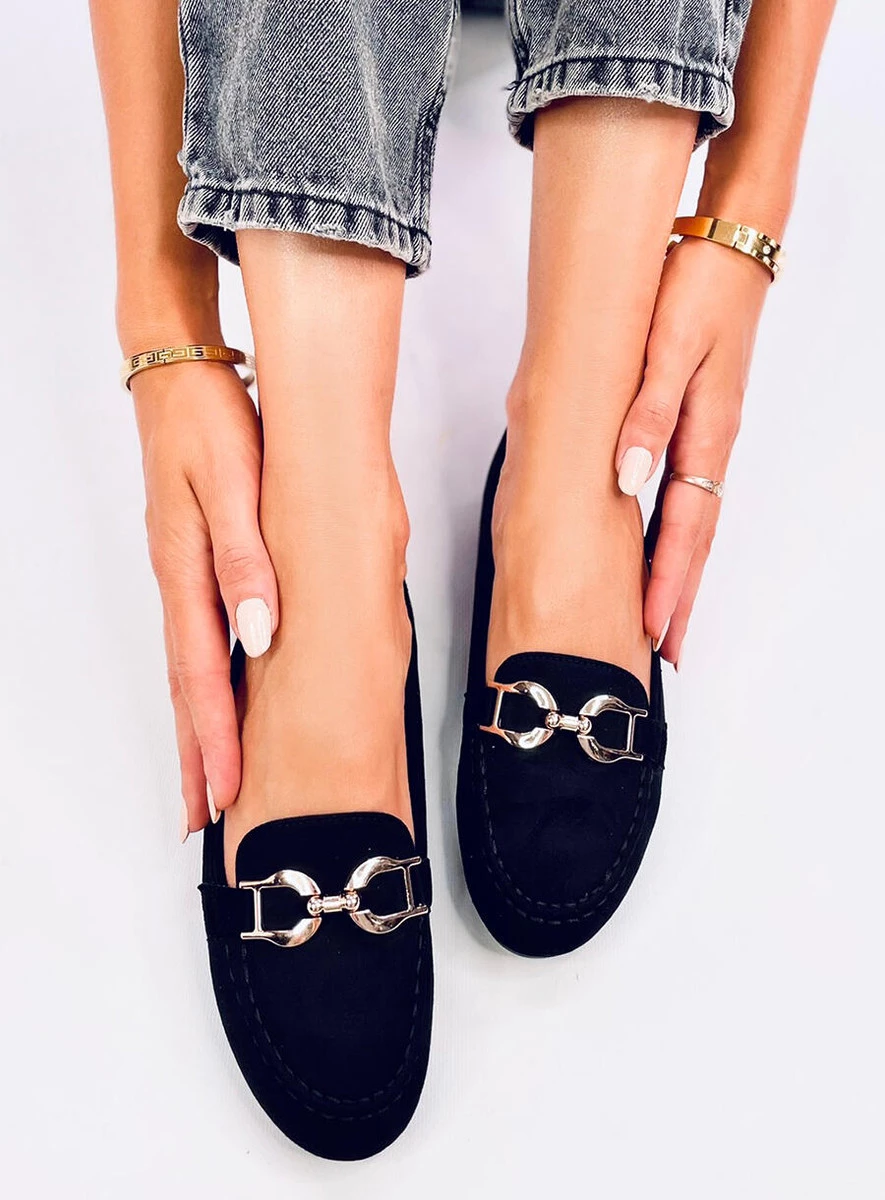 Mokasyny damskie zamszowe. Połączenie klasycznego fasonu ze stylową, złotą ozdobą daje najlepszy efekt : ) Ten wyjątkowy model ma komfortowe, zaokrąglone noski oraz mięciutką wkładkę wewnętrzną z poduszeczką - czego chcieć więcej? : ) Materiał zewnętrzny - zamsz ekologiczny.