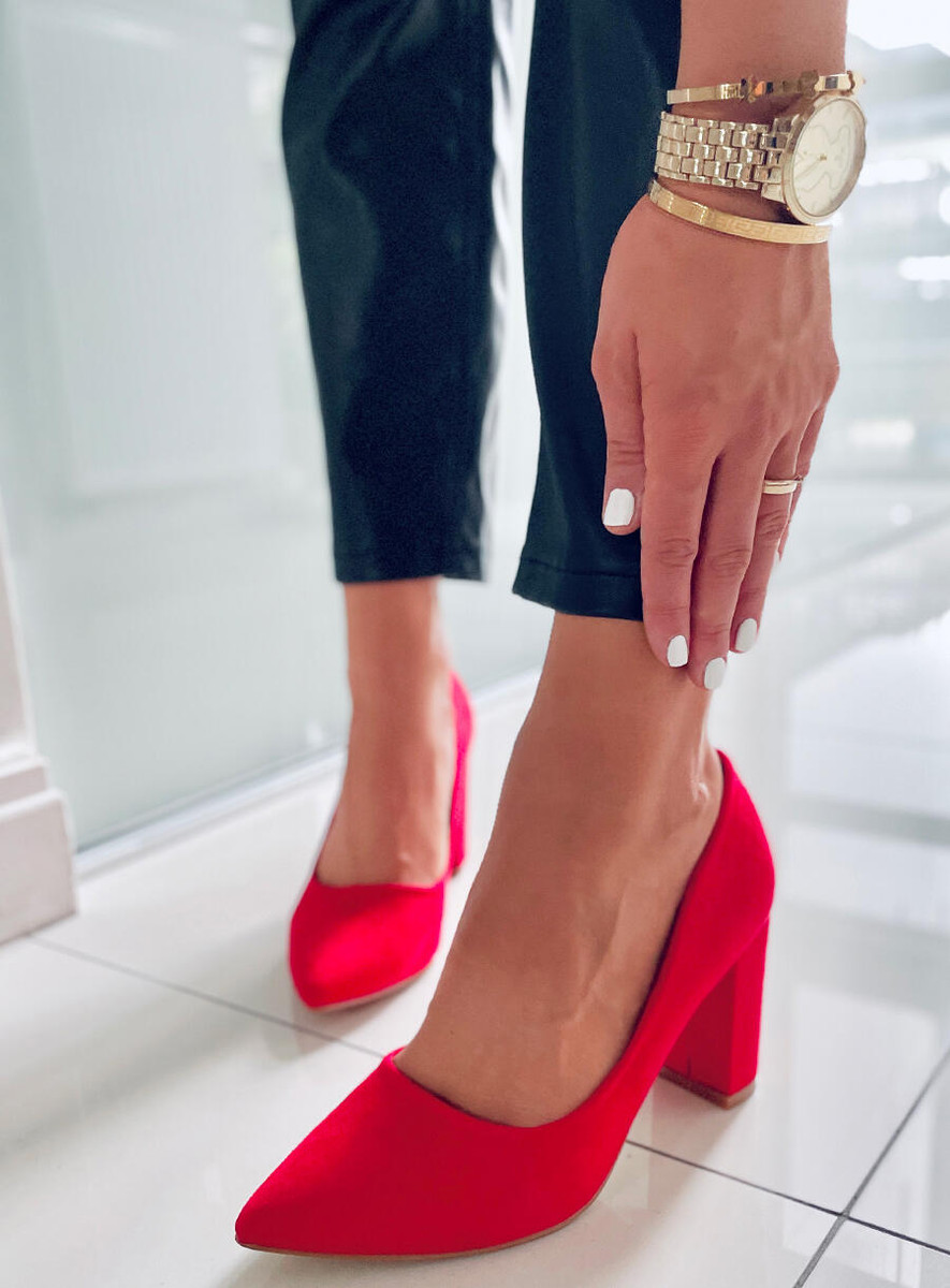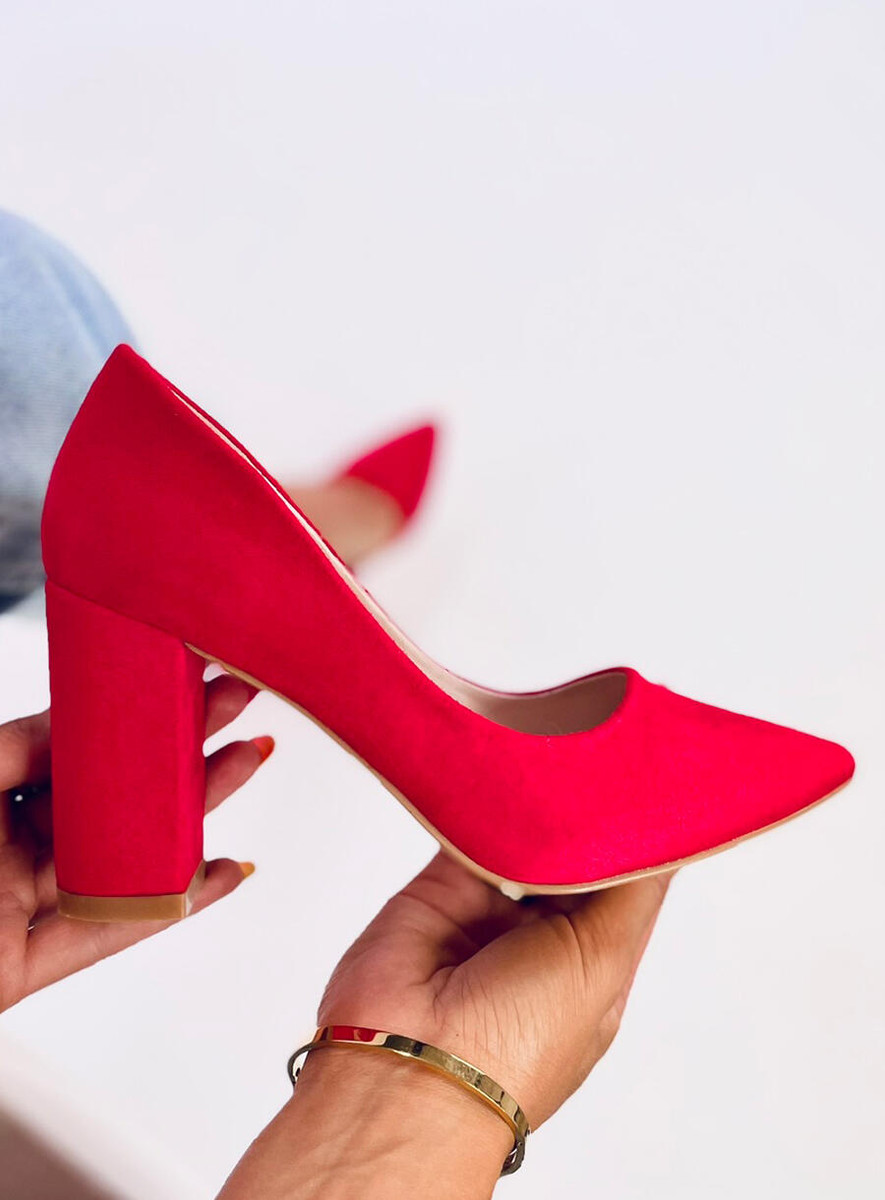 Czółenka damskie na słupku o wysokości 8 cm. Urzekają przepięknym, bardzo kobiecym i eleganckim fasonem z noskami w delikatny szpic. Wykonane są z bardzo miłego w dotyku zamszu ekologicznego, który podkreśla ich wyjątkowy styl. Tak niewiele trzeba, żeby je pokochać!