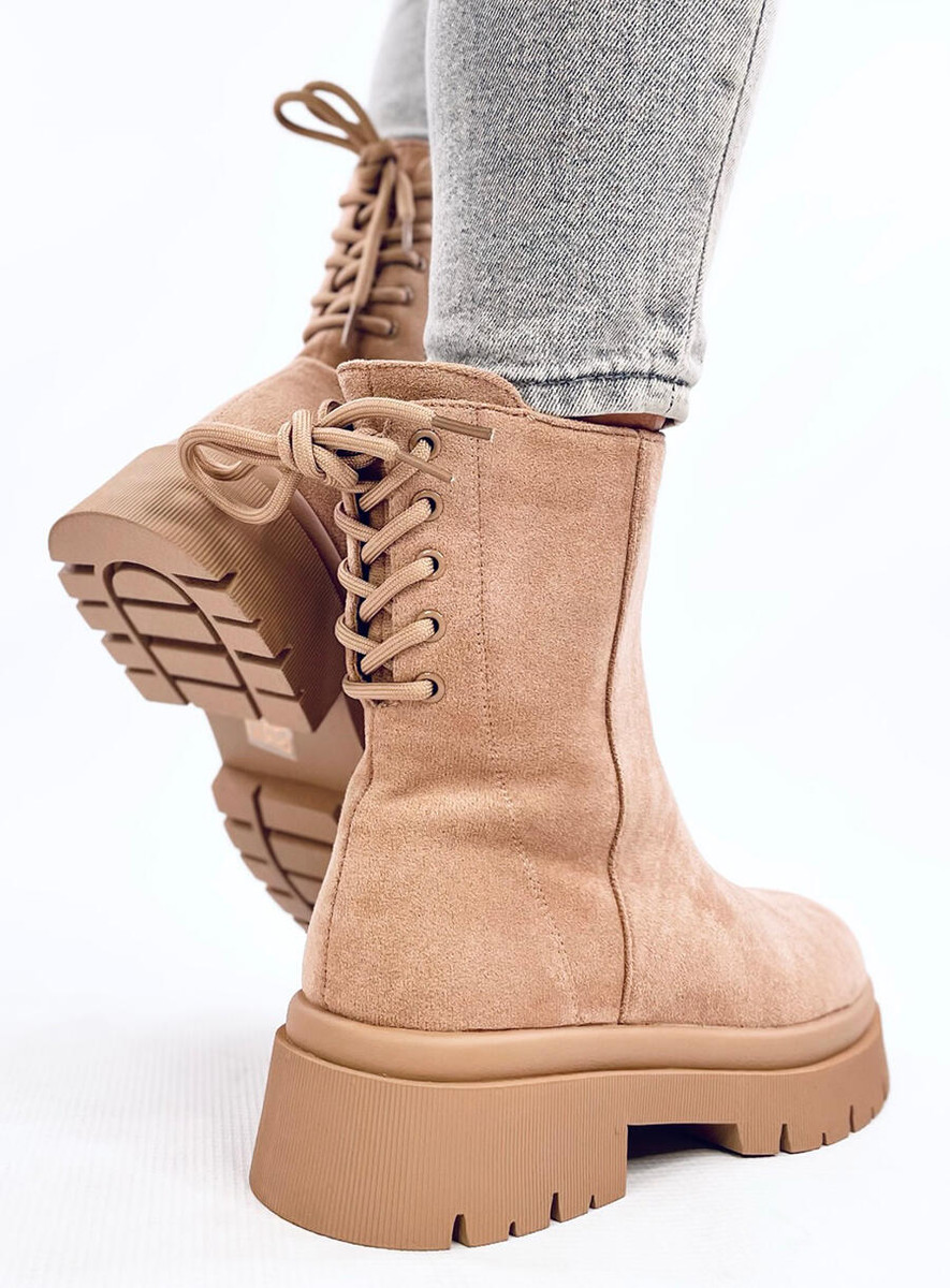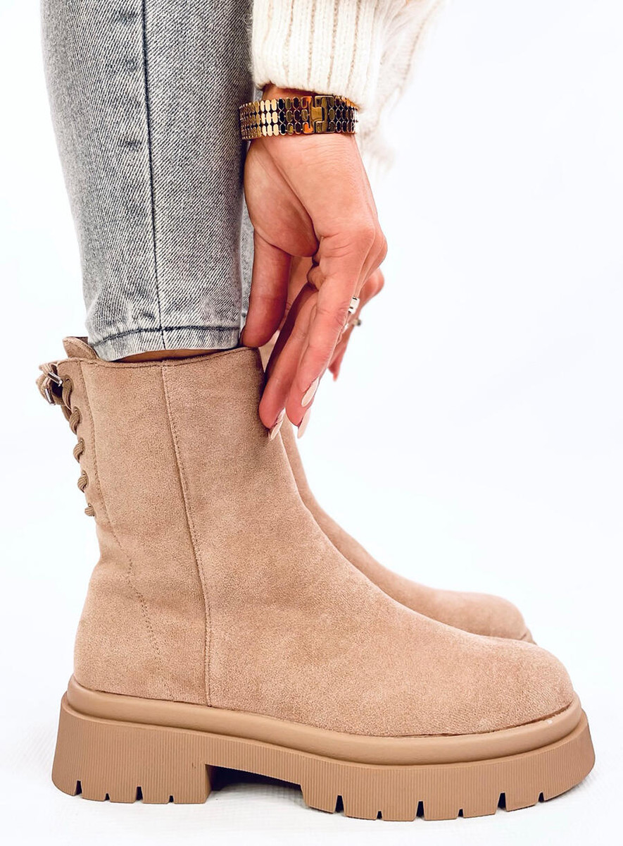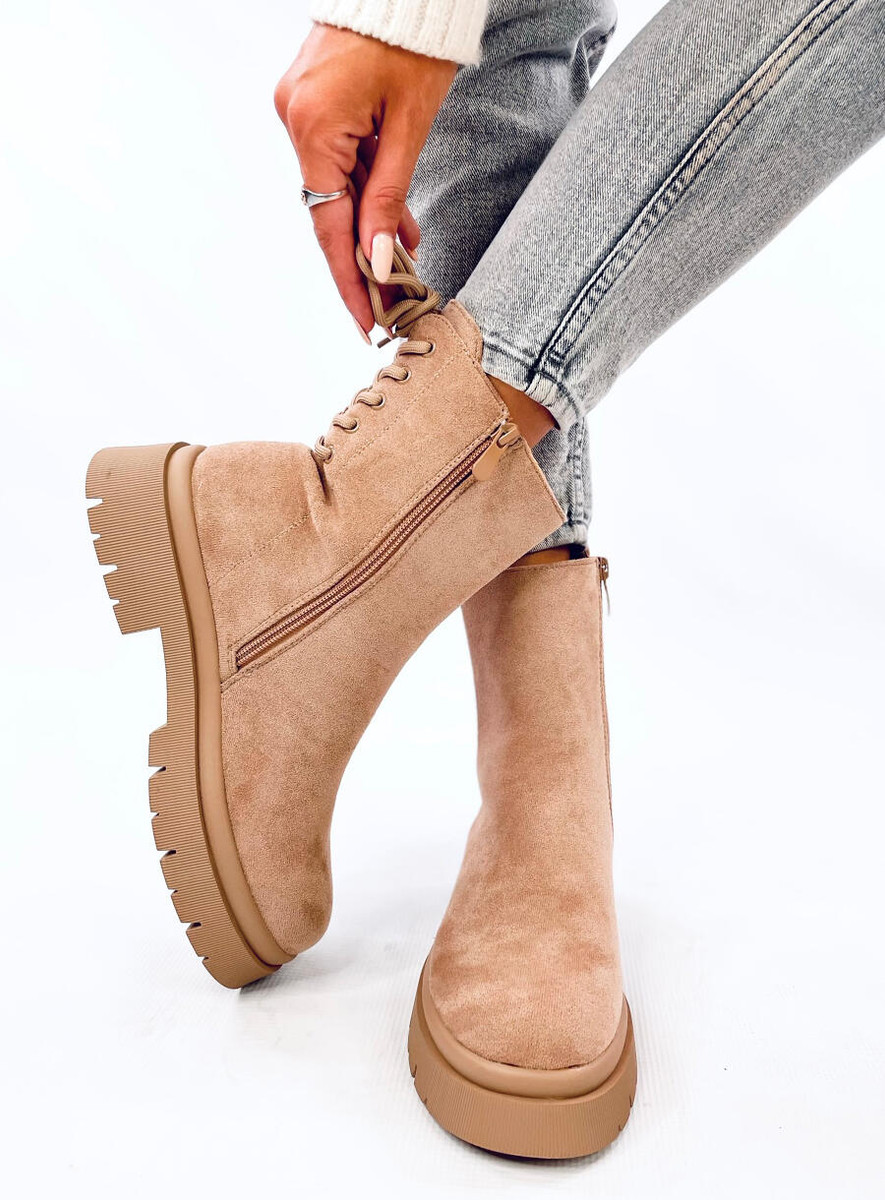 Zamszowe botki damskie na wysokiej podeszwie. Wyjątkowy urok tego modelu tkwi w jego ponadczasowym fasonie z ozdobnym sznurowaniem z tyłu cholewki. Mają to "coś"! Praktyczne zapięcie na zamek błyskawiczny z boku cholewki zapewni komfortowe zakładanie. Wykonane są z zamszu ekologicznego, a wnętrze wyścielone jest delikatnym futerkiem.