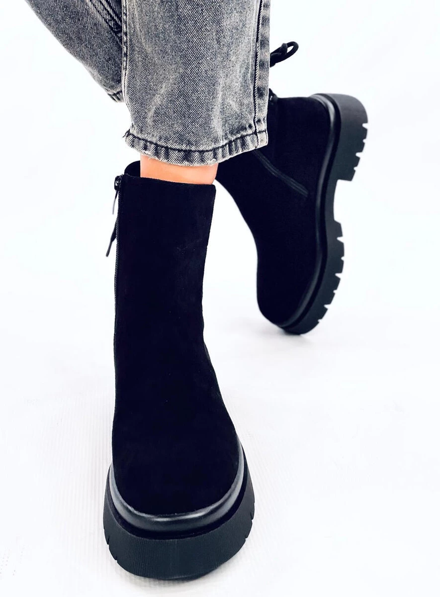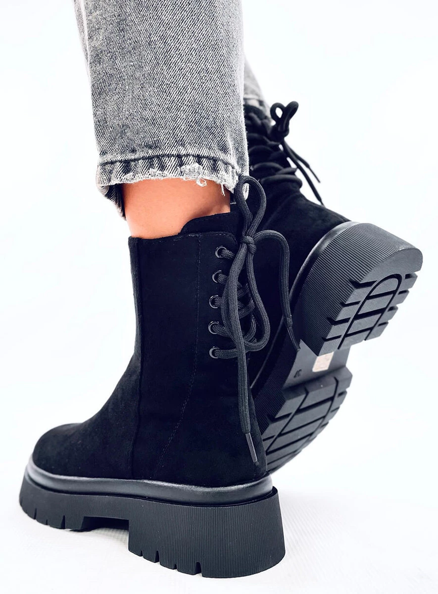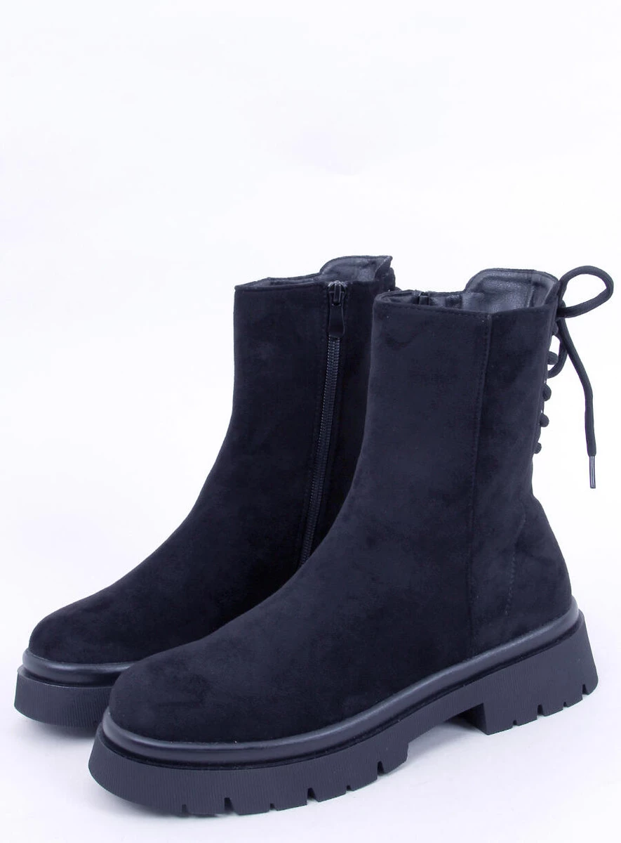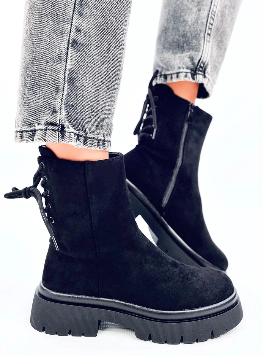 Zamszowe botki damskie na wysokiej podeszwie. Wyjątkowy urok tego modelu tkwi w jego ponadczasowym fasonie z ozdobnym sznurowaniem z tyłu cholewki. Mają to "coś"! Praktyczne zapięcie na zamek błyskawiczny z boku cholewki zapewni komfortowe zakładanie. Wykonane są z zamszu ekologicznego, a wnętrze wyścielone jest delikatnym futerkiem.