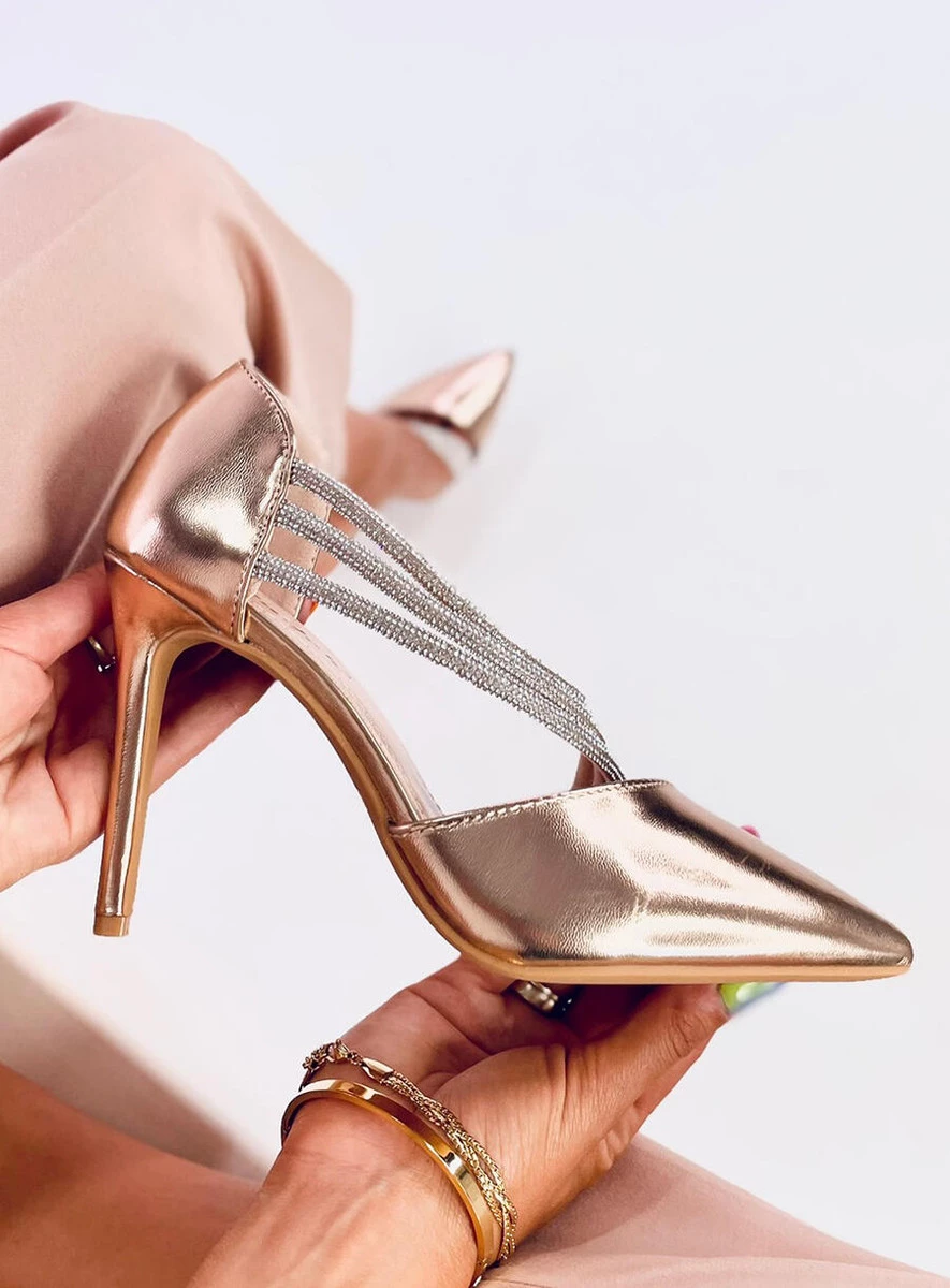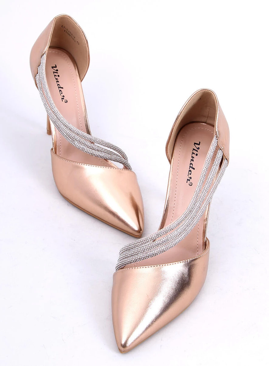 Asymetryczne szpilki damskie. Jeśli chcesz przyciągać spojrzenia to ten model w metalicznym wykończeniu dla Ciebie! Zgrabny, asymetryczny fason z paseczkami wysadzanymi cyrkoniami sprawia, że stopa zgrabnie się w nich prezentuje, a obcas o wysokości 10,5 cm zapewni bajecznie długie nogi! Doskonałe na wyjątkowe okazje - wesela, bale, studniówki... Materiał zewnętrzny - skóra ekologiczna.