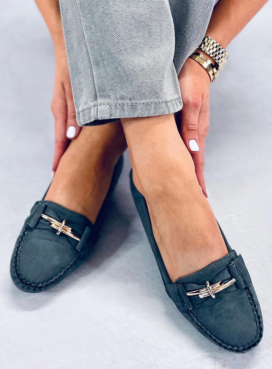 Zamszowe mokasyny damskie. Ponadczasowy fason z przeszyciami idealnie komponuje się ze stylową złotą ozdobą... Mięciutka wkładka wewnętrzna z poduszeczką to kolejny argument, który przemawia, za tymi wyjątkowymi butami. Powinny znaleźć się w każdej kobiecej garderobie : ) Materiał zewnętrzny - zamsz ekologiczny.