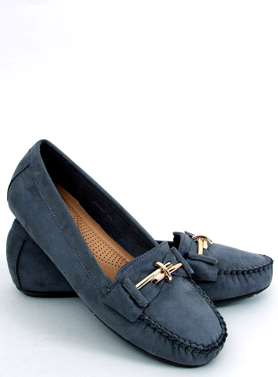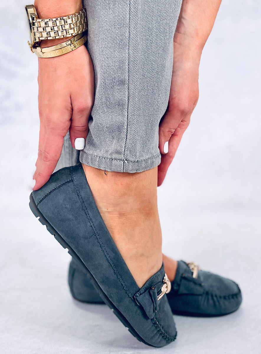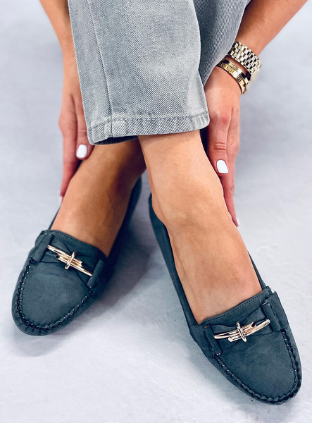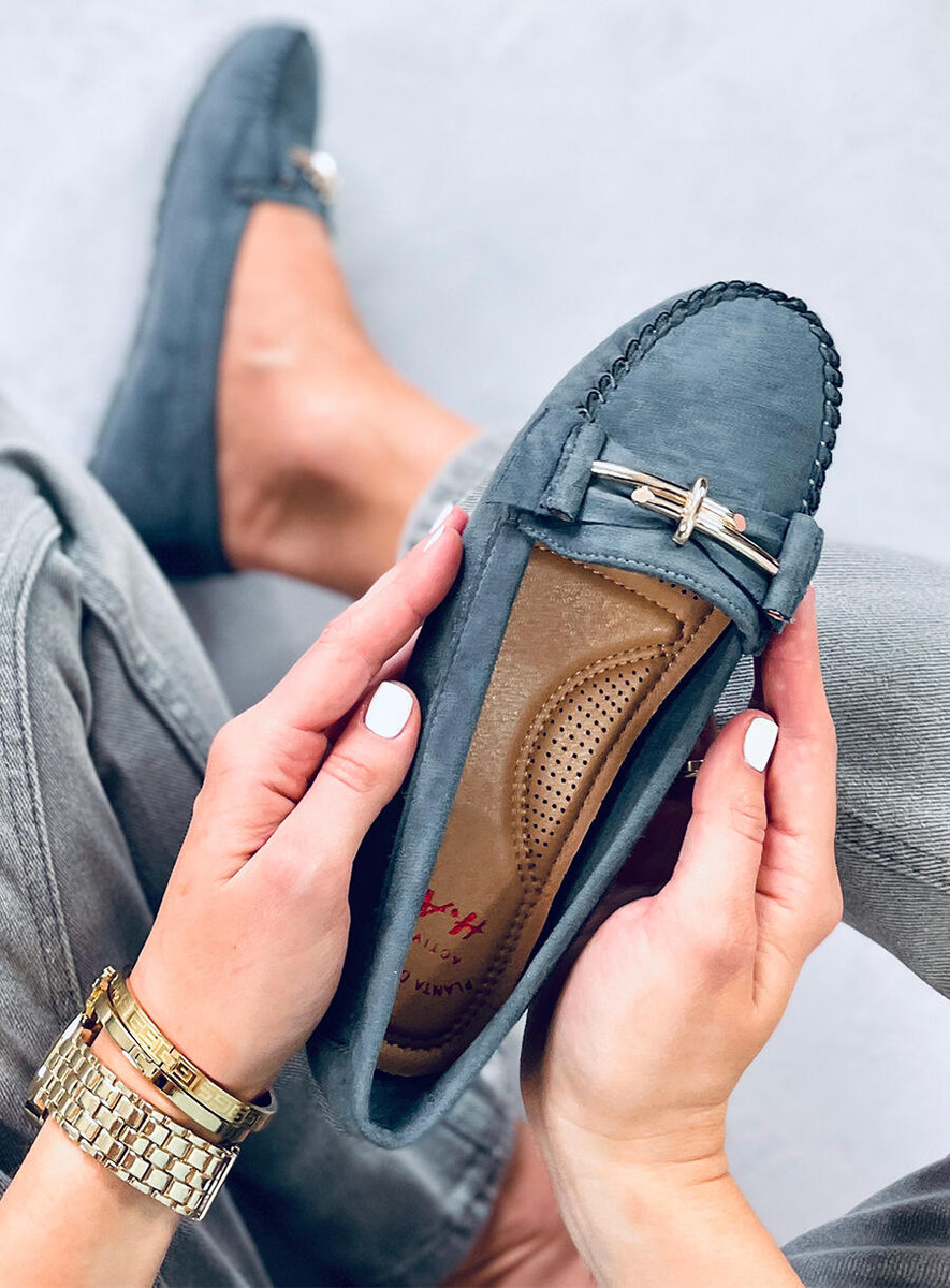 Zamszowe mokasyny damskie. Ponadczasowy fason z przeszyciami idealnie komponuje się ze stylową złotą ozdobą... Mięciutka wkładka wewnętrzna z poduszeczką to kolejny argument, który przemawia, za tymi wyjątkowymi butami. Powinny znaleźć się w każdej kobiecej garderobie : ) Materiał zewnętrzny - zamsz ekologiczny.