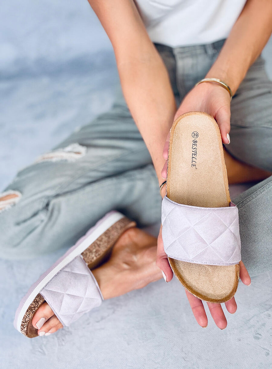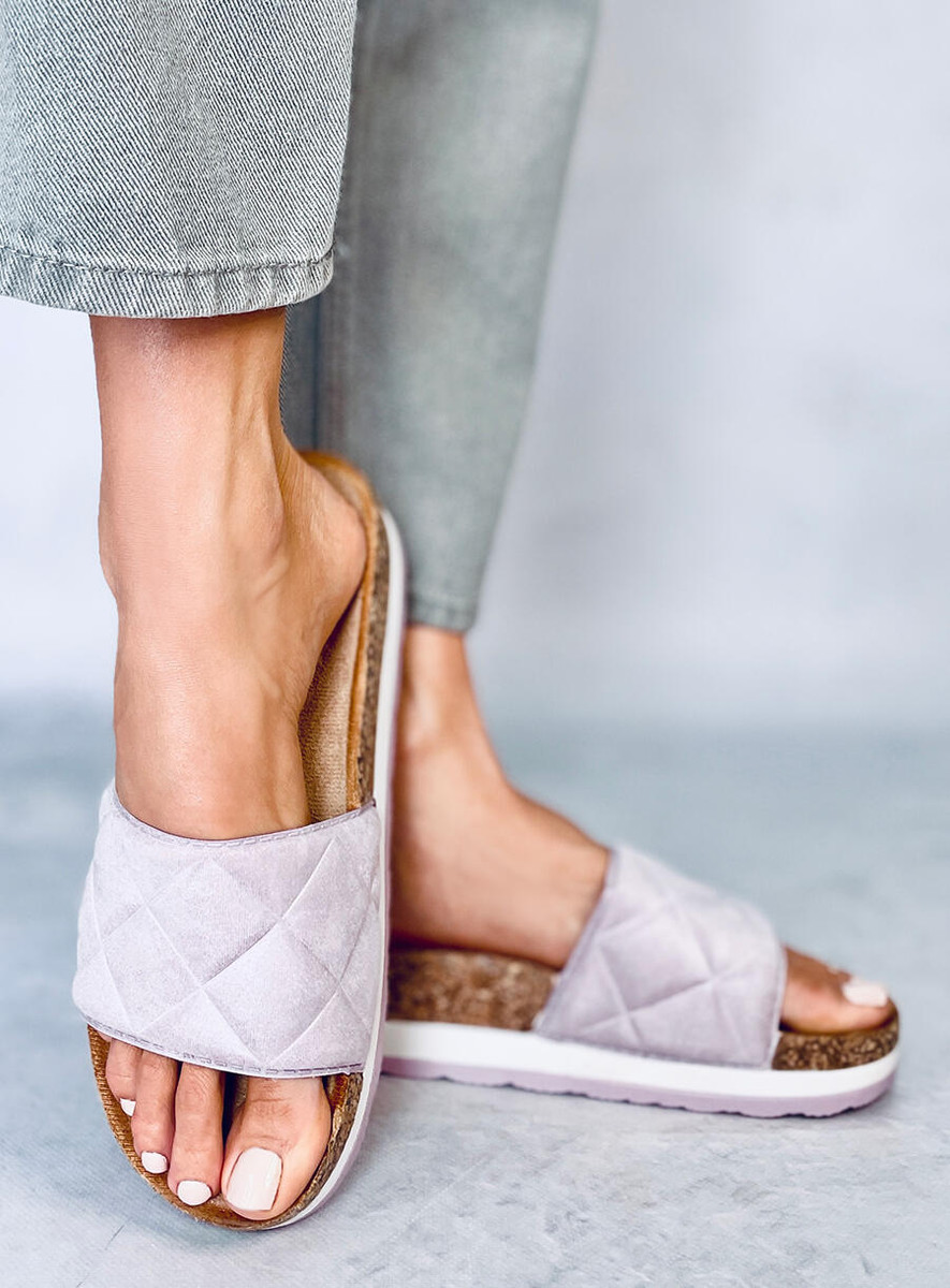 Korkowe klapki damskie. Model na wysokiej podeszwie (4 cm) idealnie wpisuje się w trendy tego sezonu. Ma być modnie i komfortowo! Szeroki, zamszowy pasek z efektownym pikowaniem świetnie trzyma stopę. Jesteśmy przekonane, że te klapki spełnią Twoje oczekiwania : ) Materiał zewnętrzny – zamsz ekologiczny.