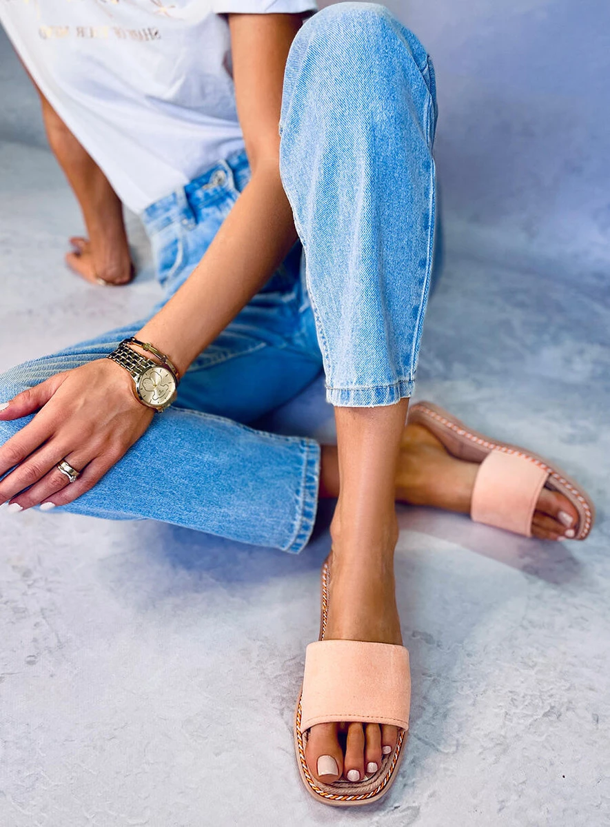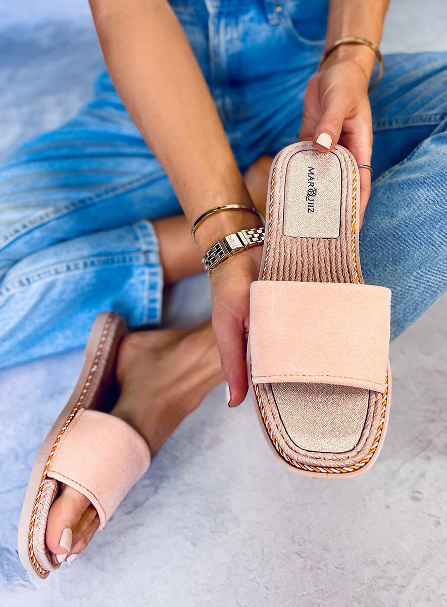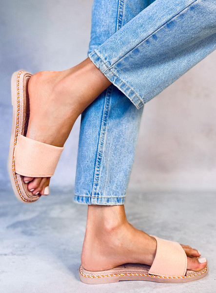 Klapki damskie na sprężystej podeszwie. Ozdobna lamówka oraz wkładka wewnętrzna z przepięknie mieniącą się wstawką ożywiają całość i podkreśla letni charakter tego modelu : ) Pas wykonany z zamszu ekologicznego natomiast świetnie trzyma stopę. Są idealne na wakacyjne przygody! Materiał zewnętrzny – zamsz ekologiczny.