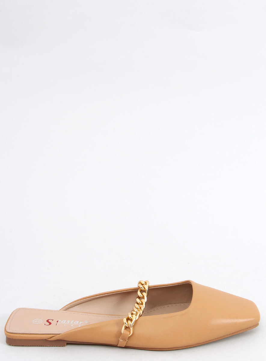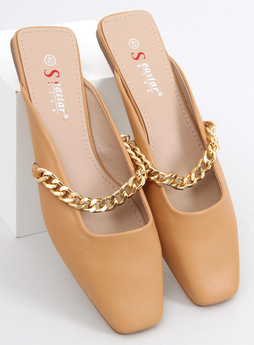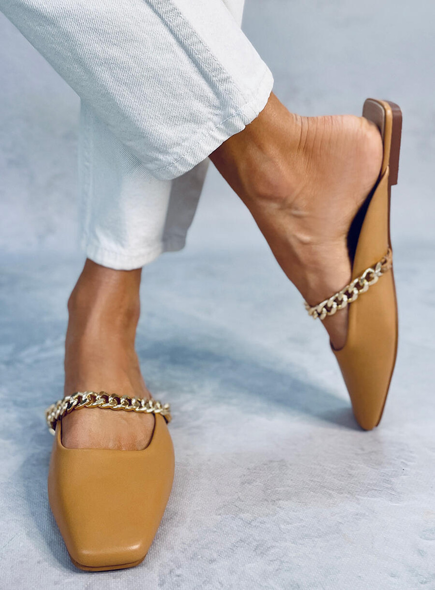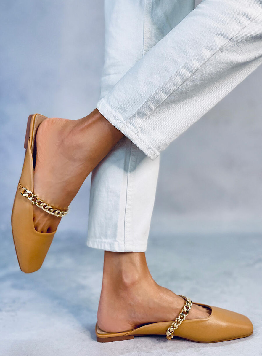 Licowe klapki damskie. Ten wyjątkowy model ma najmodniejszy fason z kwadratowymi noskami i złotym łańcuszkiem, który pięknie podkreśla śródstopie... Przekonaj się sama, że te buty to spełnienie marzeń : ) Materiał zewnętrzny – skóra ekologiczna.