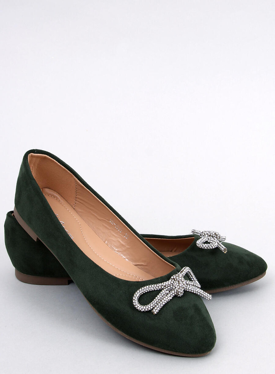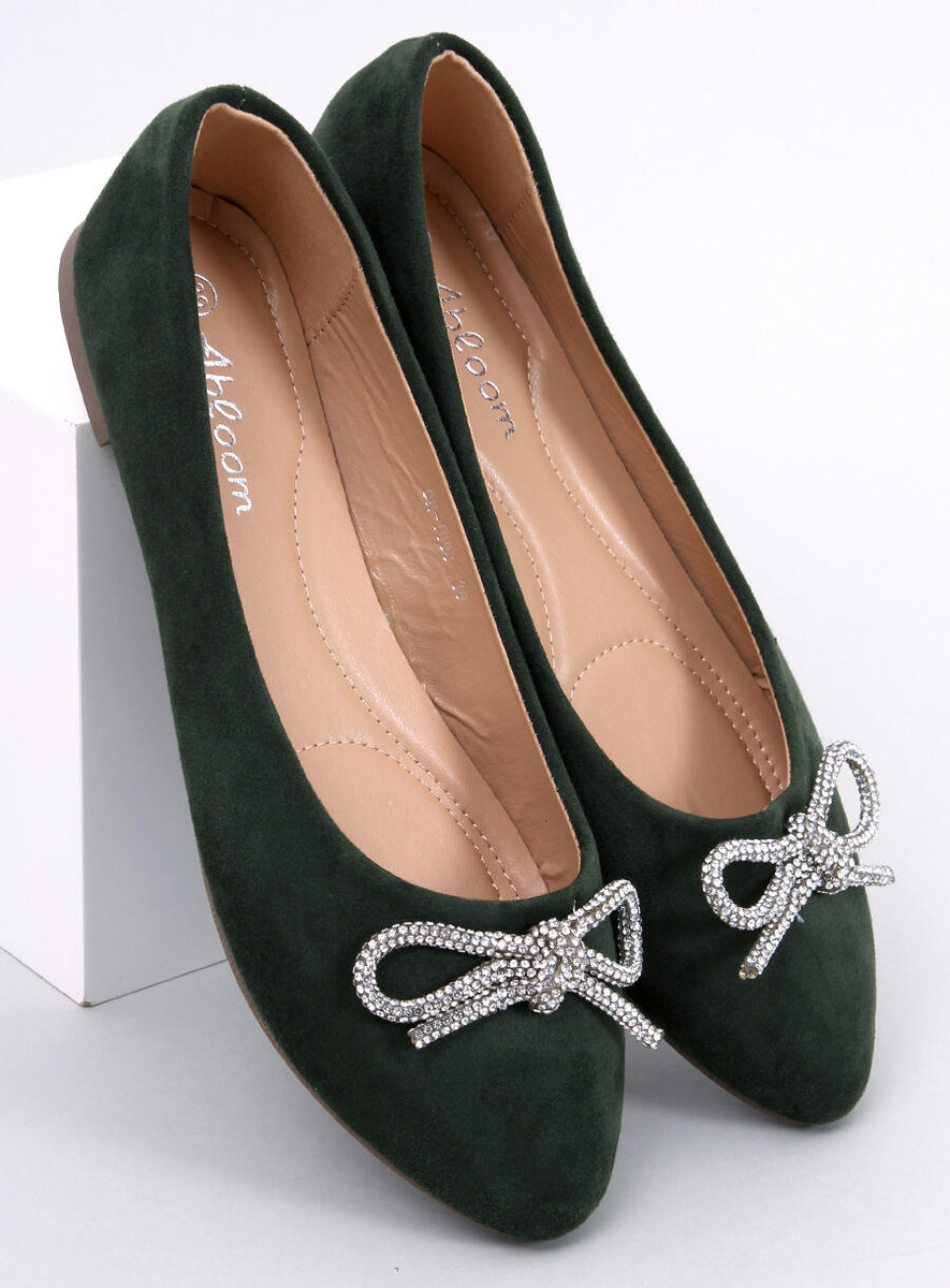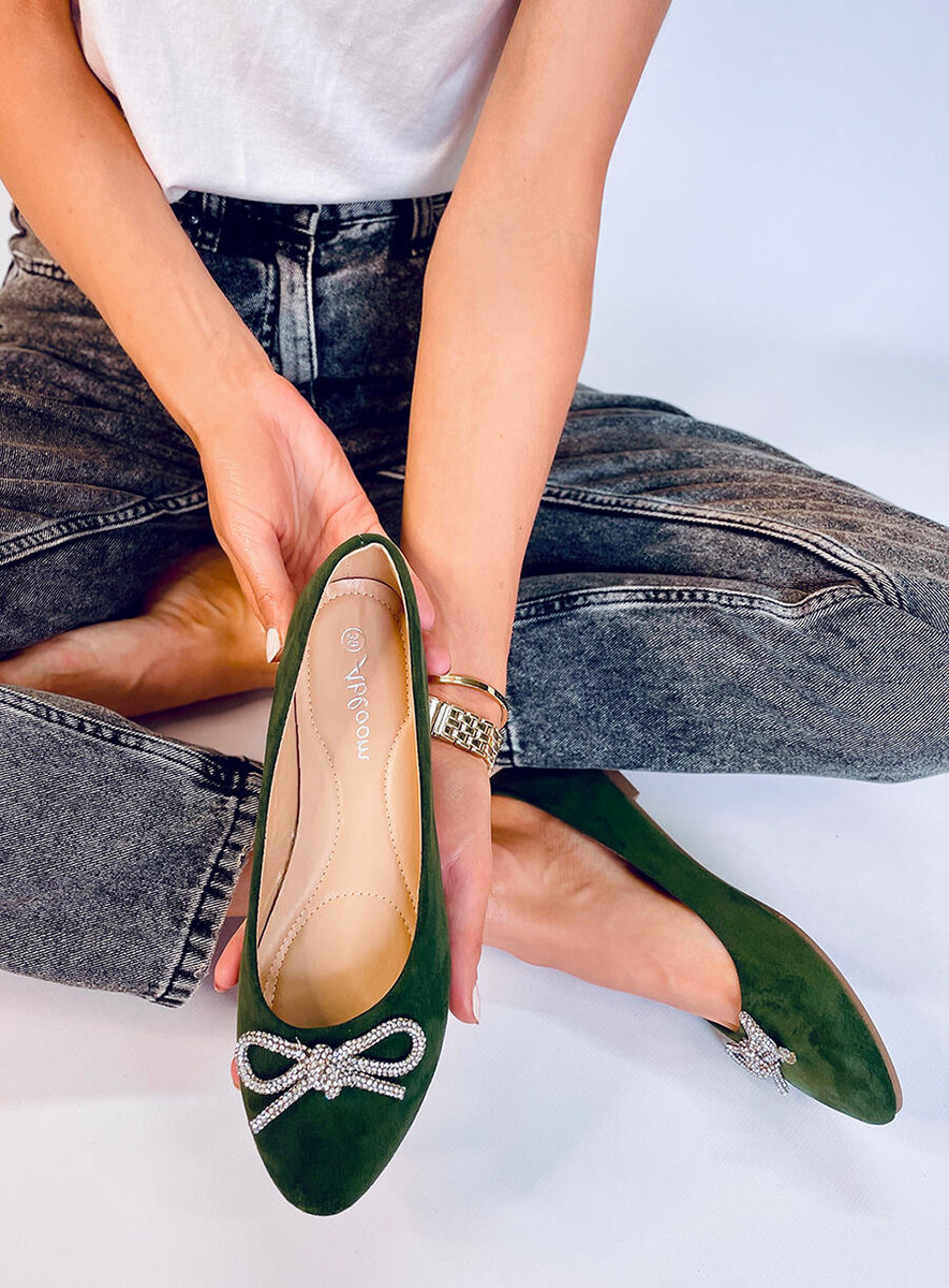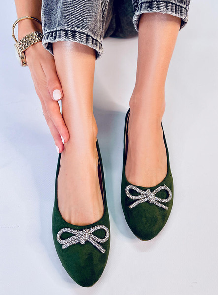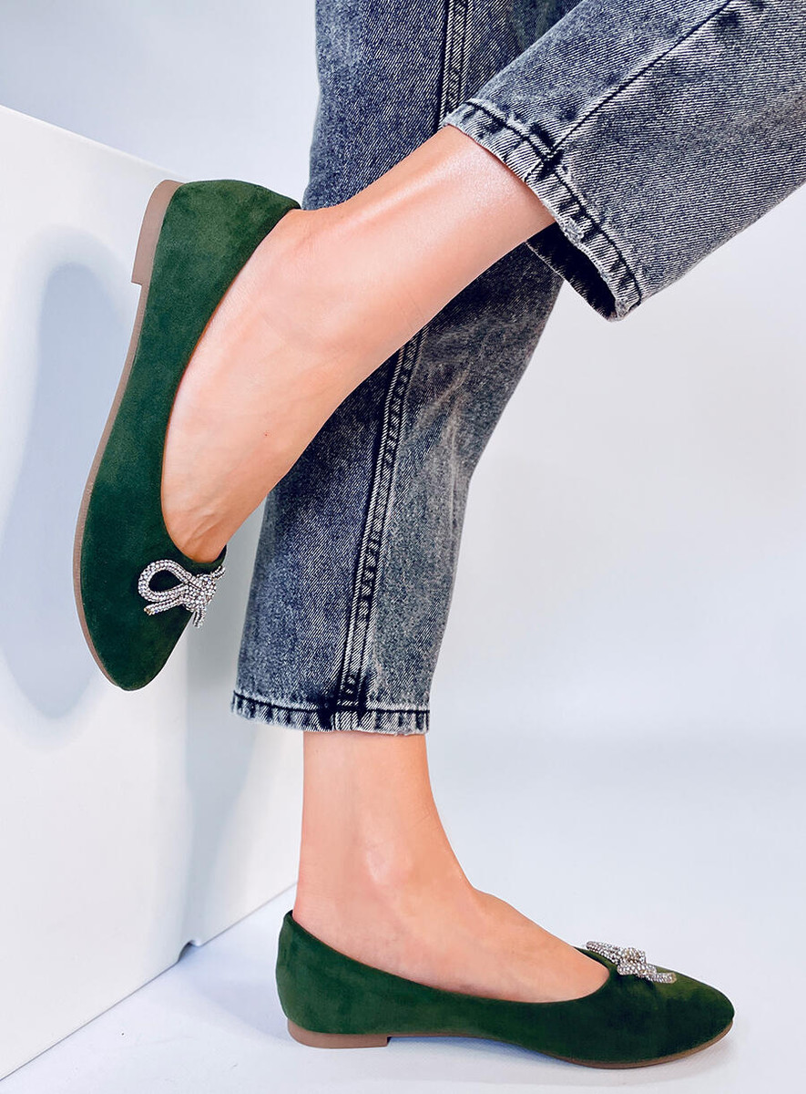 Baleriny damskie zamszowe. Mają zgrabny fason z migdałowymi noskami, które ozdobione są kokardą wysadzaną błyszczącymi cyrkoniami. Mięciutka wkładka wewnętrzna z poduszeczką zapewni wygodę na każdym kroku. Nie czekaj : ) Materiał zewnętrzny – zamsz ekologiczny.