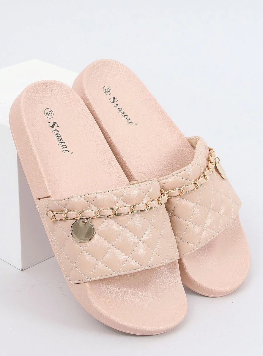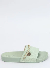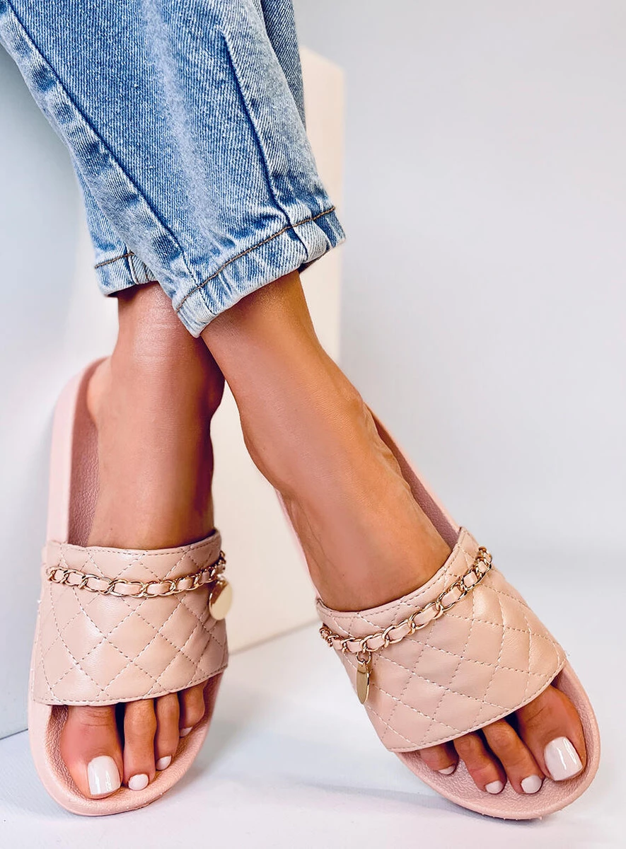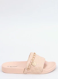 Stylowe klapki damskie. Dla prawdziwych gwiazd tego lata mamy wyjątkowy model z efektownym pikowaniem oraz najmodniejszym łańcuszkiem. Jeśli chcesz przyciągnąć spojrzenia to po prostu musisz je mieć! Materiał zewnętrzny - skóra ekologiczna.