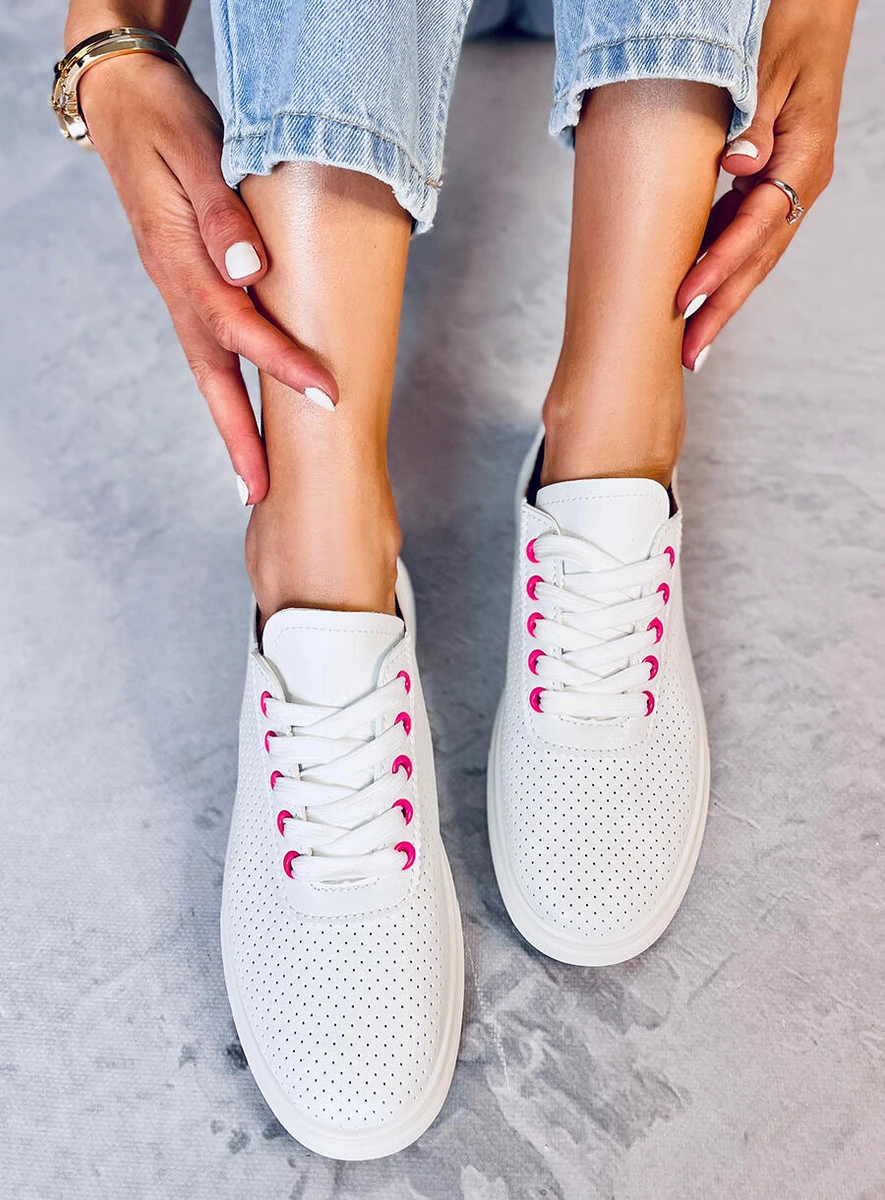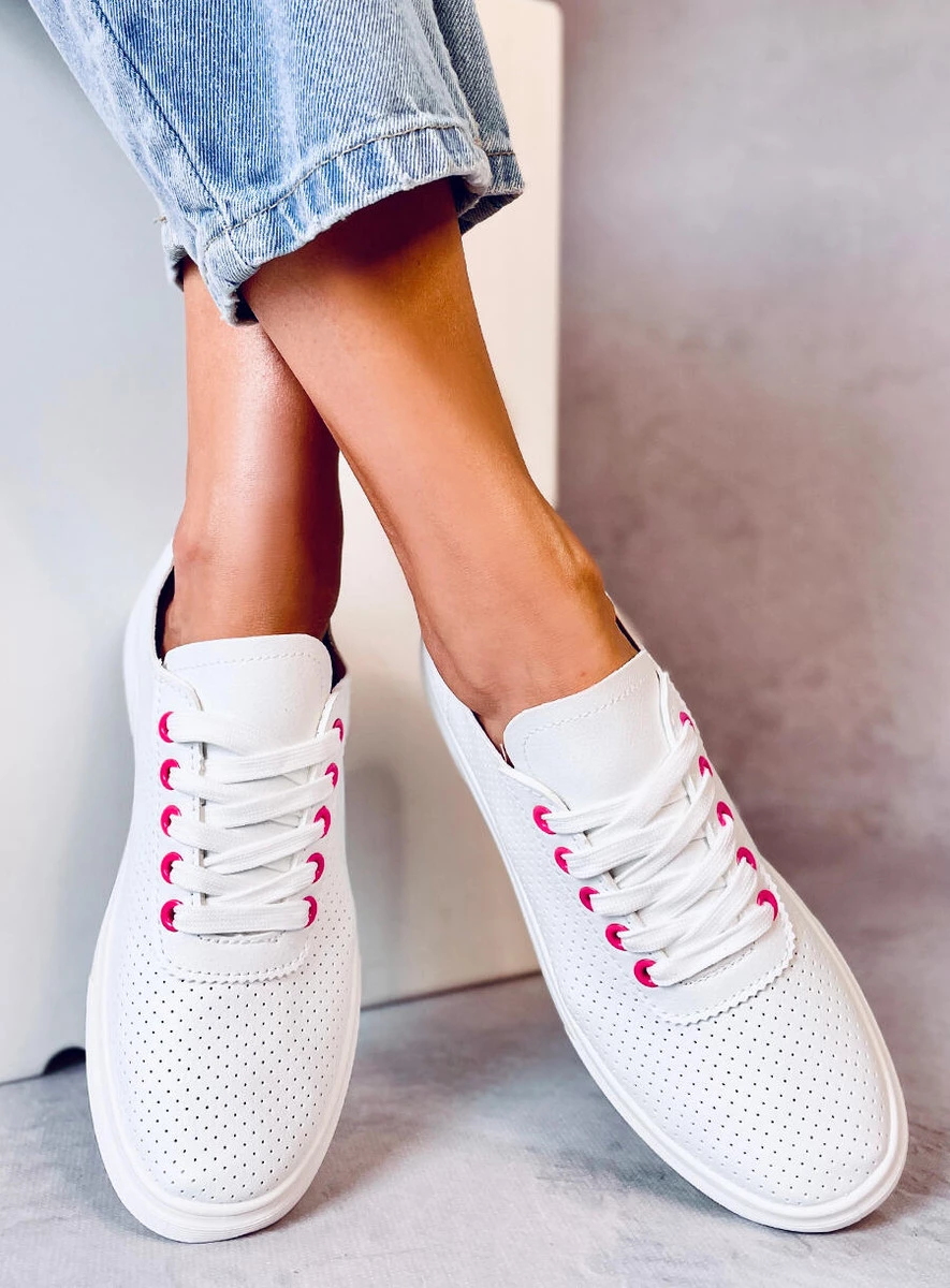 Trampki damskie sznurowane. Kontrastowe elementy – szlufki oraz wstawki z tyłu, a także oryginalna, dziurkowana faktura eko skóry sprawia, że te buty mają tak zwane „to coś”. Są on również niesamowicie wygodne... Chyba już wiesz, które buty będą od teraz królowały w Twojej garderobie : ) Wkładka wewnętrzna – tkanina.