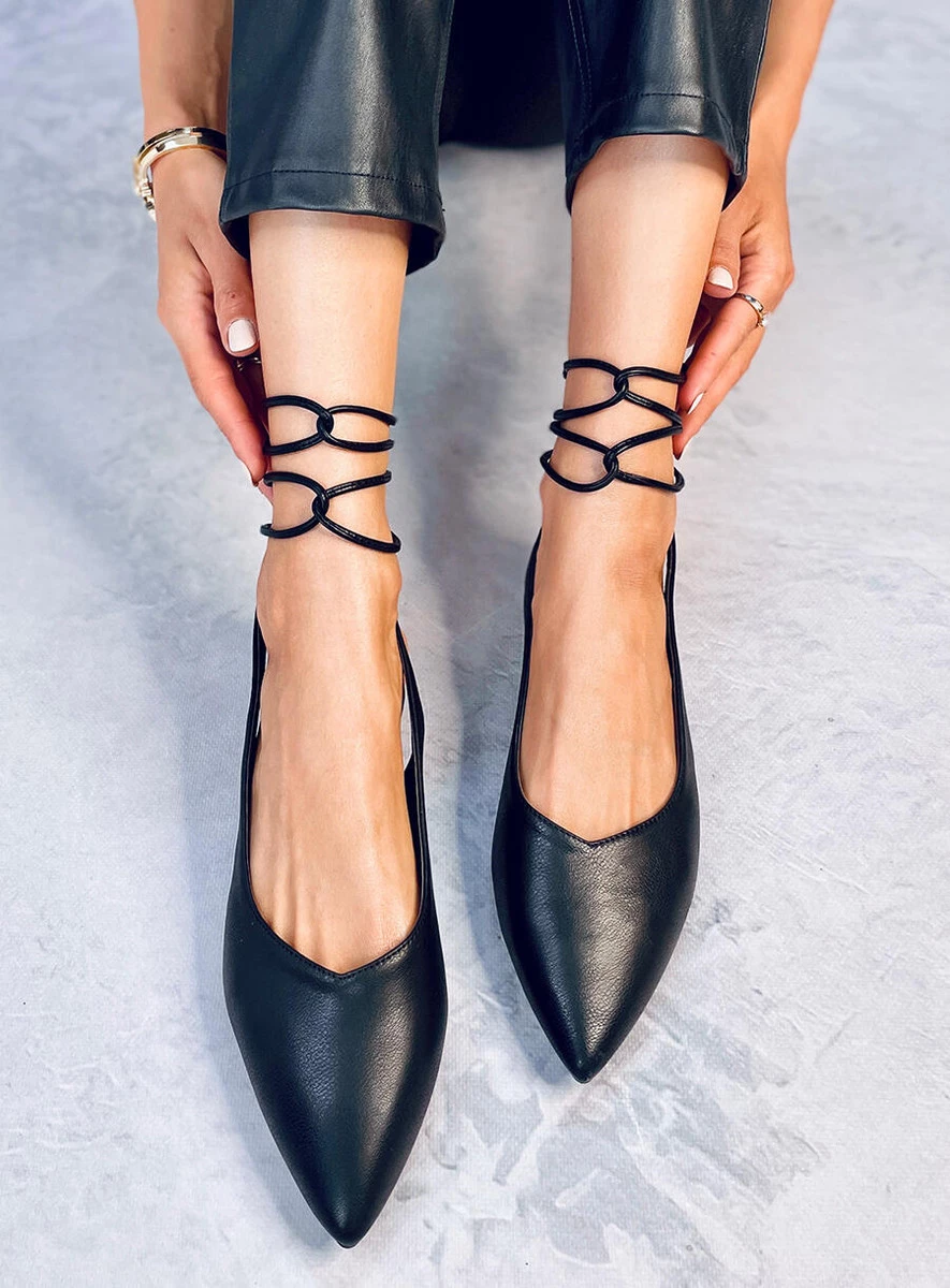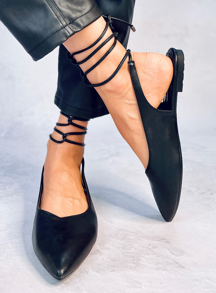 Licowe baleriny damskie z odkrytą piętą. Ten wyjątkowy model ma klasyczny fason ze zwężającymi się noskami i zmysłowym wiązaniem - pięknie prezentują się na nodze! Nie czekaj i zamów je już dziś, a nie pożałujesz : ) Materiał zewnętrzny – skóra ekologiczna.