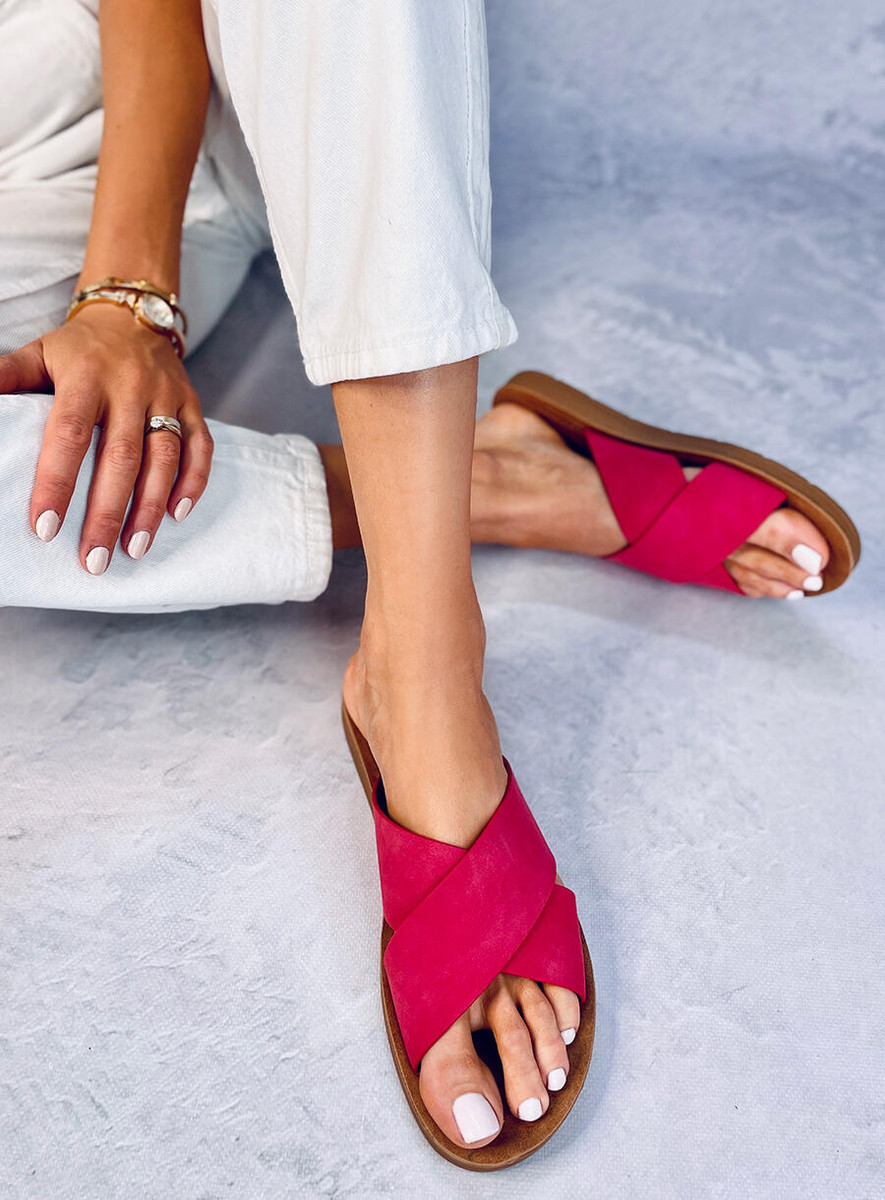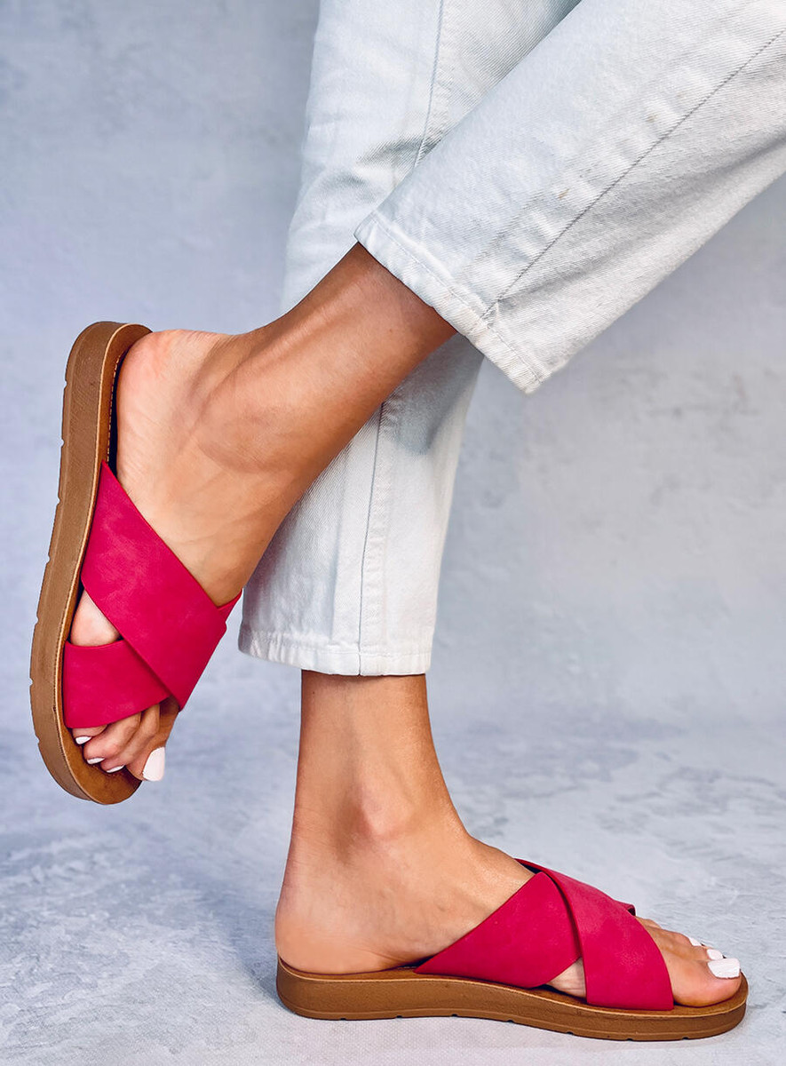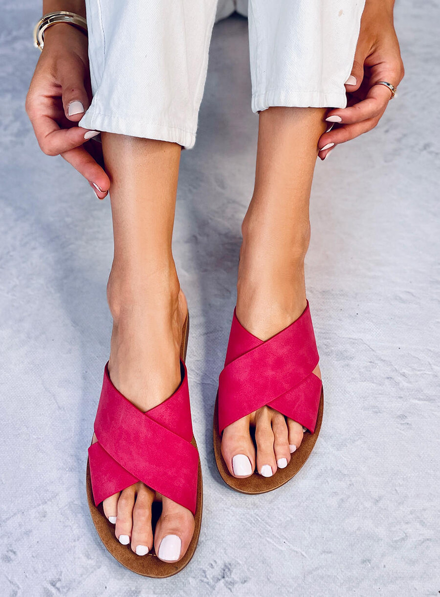 Klapki damskie na płaskiej podeszwie. Model ma ponadczasowy fason z krzyżującymi się paskami w matowym wykończeniu... Klapki to patent na wygodę, a ponadto pozycja obowiązkowa w każdej letniej garderobie : ) Materiał zewnętrzny – skóra ekologiczna matowa.