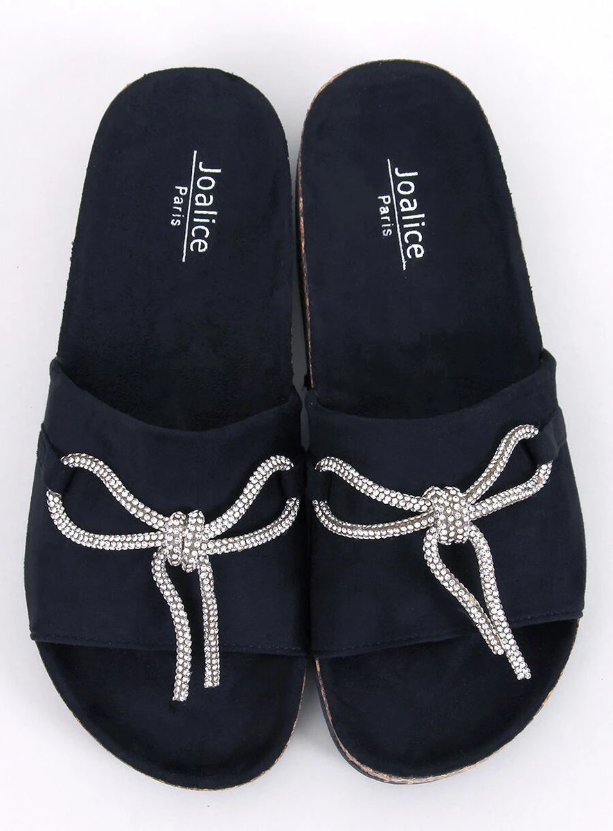 Klapki damskie na korkowej podeszwie. Zamszowy pasek ozdobiony kokardą z błyszczących kamieni nadaje butom wyjątkowego uroku. Jesteśmy przekonane, że te klapki z profilowaną wkładką wewnętrzną spełnią Twoje oczekiwania : ) Materiał zewnętrzny – zamsz ekologiczny.