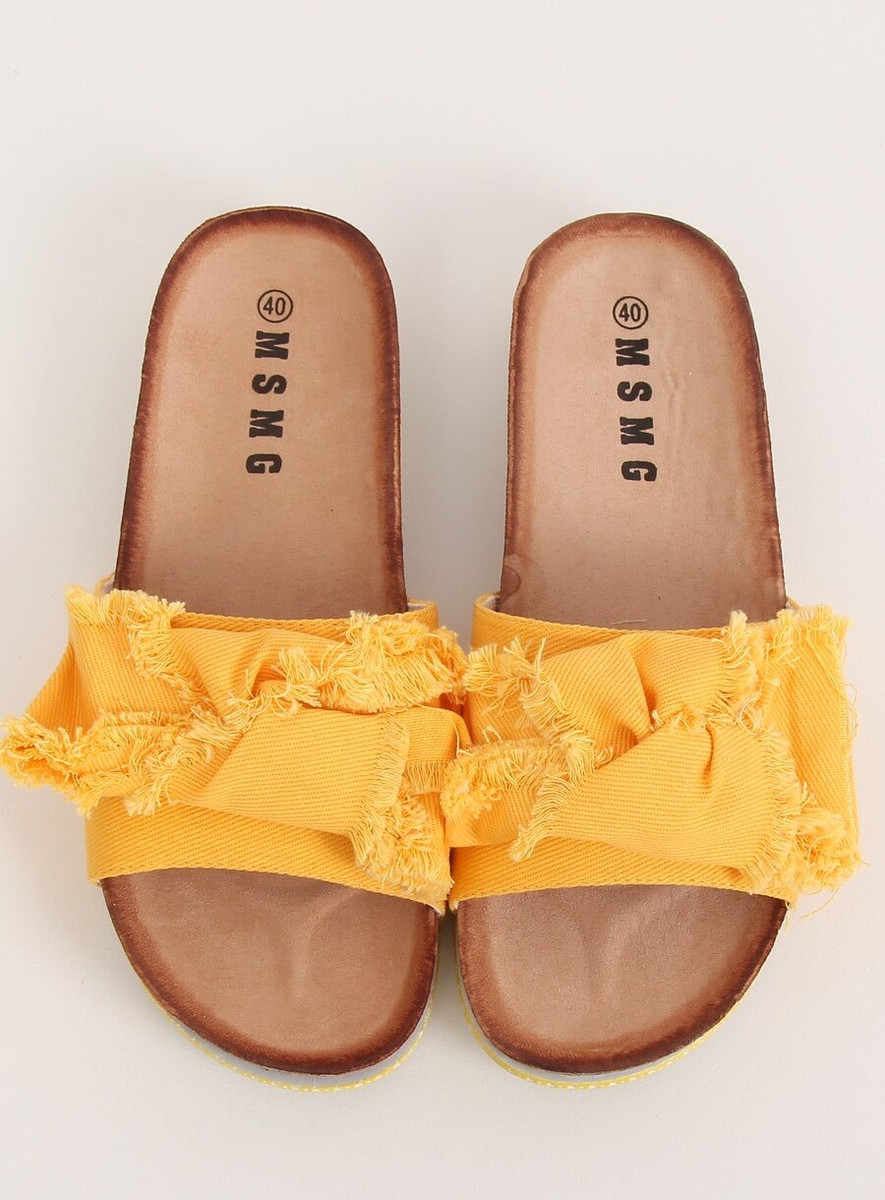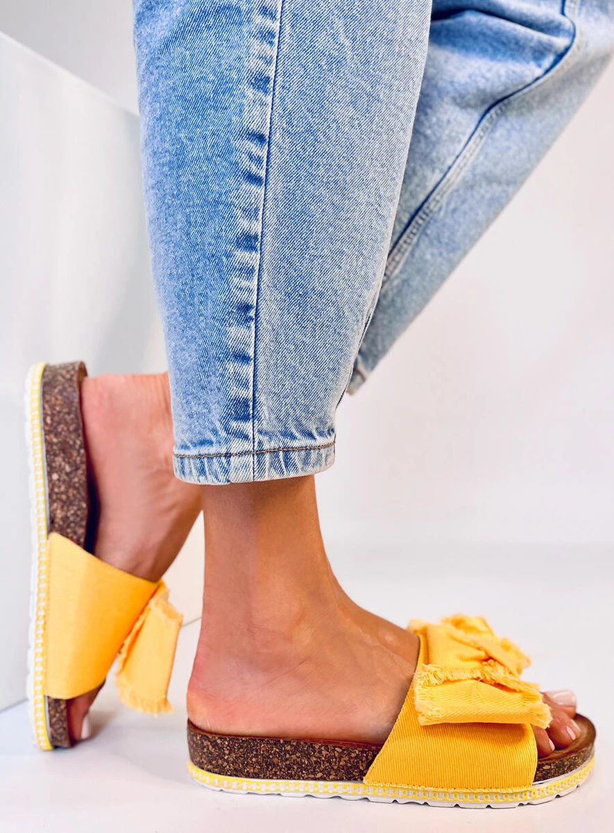 Klapki damskie na korkowej podeszwie. To co przyciąga uwagę to efektownie postrzępiona kokardka, która nadaje im ciekawego wyrazu... Możesz je z powodzeniem nosić do letnich sukienek czy spodenek: ) Profilowana wkładka wewnętrzna natomiast sprawi, że nie straszne Ci będą długie spacery - sprawdź to sama! Materiał zewnętrzny – tkanina.