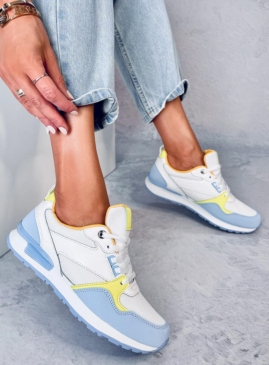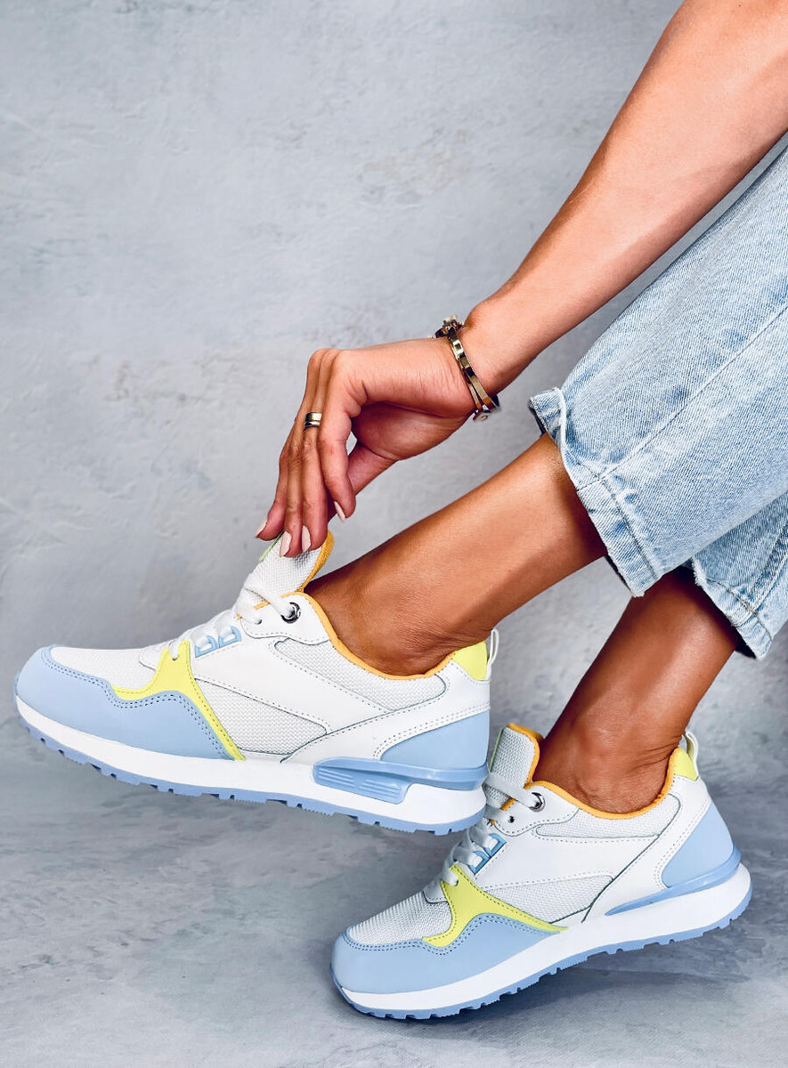 Sznurowane buty sportowe damskie - sneakersy. Model charakteryzuje klasyczny fason z najmodniejszymi, kolorowymi dodatkami... Świetnie sprawdzą się w wielu miejskich stylizacjach - sprawdź sama z czym najlepiej się komponują : ) Wnętrze butów wyścielone jest tkaniną. Materiał zewnętrzny – skóra ekologiczna + zamsz ekologiczny + tkanina.
