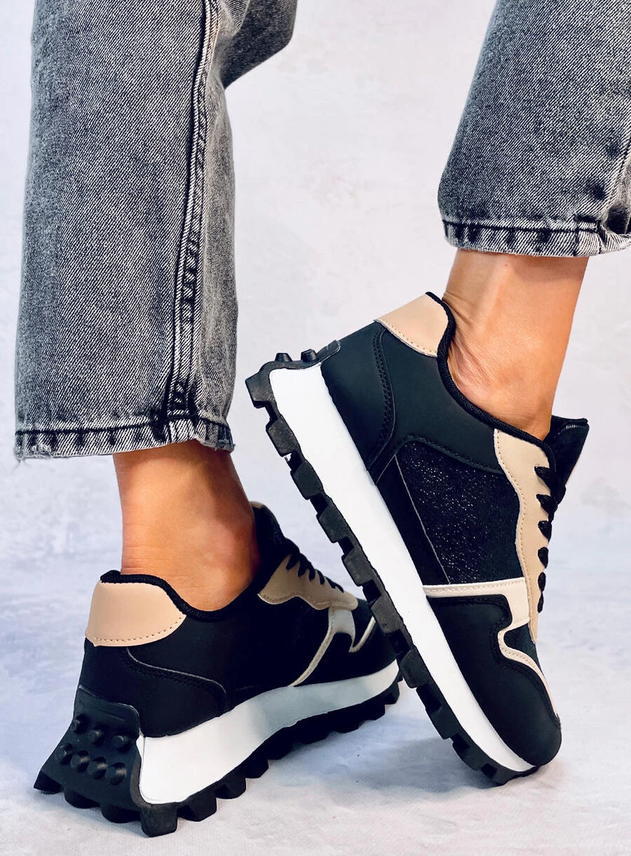 Buty sportowe - sneakersy damskie na platformie o wysokości 5,5 cm. Ten efektowny model wyróżnia się metalicznymi dodatkami oraz designerską podeszwą. My już straciłyśmy dla nich głowę, a Ty? : ) Wnętrze wyścielone jest tkaniną. Materiał zewnętrzny – skóra ekologiczna + tkanina.