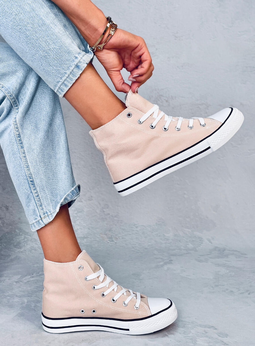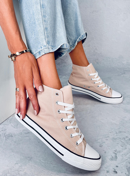 Płócienne trampki damskie za kostkę. Ten ponadczasowy model to pozycja obowiązkowa w każdej kobiecej garderobie : ) Dodatkowo dzięki tym butom będziesz cieszyła się wygodą na każdym kroku! Materiał zewnętrzny i wewnętrzny – tkanina.