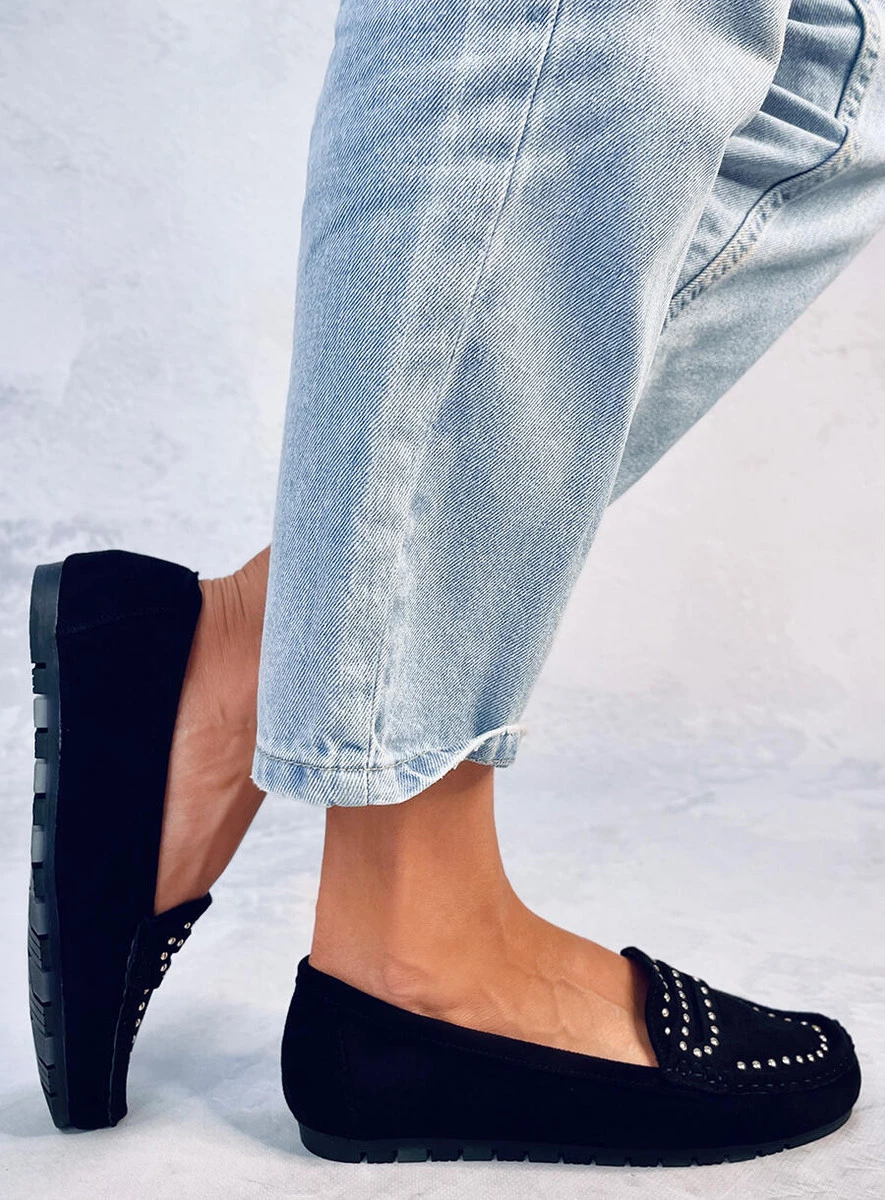 Zamszowe mokasyny damskie. Mają ponadczasowy fason z subtelnymi ćwiekami, które tworzą niepowtarzalny wzór. Mokasyny cieszą się ogromną popularnością wśród wielbicielek wygody – mięciutka wkładka wewnętrzna z poduszeczką zapewni komfort na każdym kroku. Materiał zewnętrzny - zamsz ekologiczny.