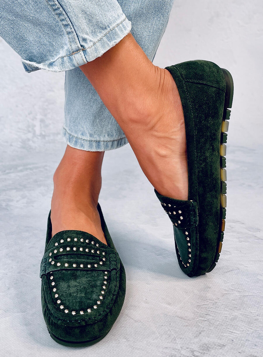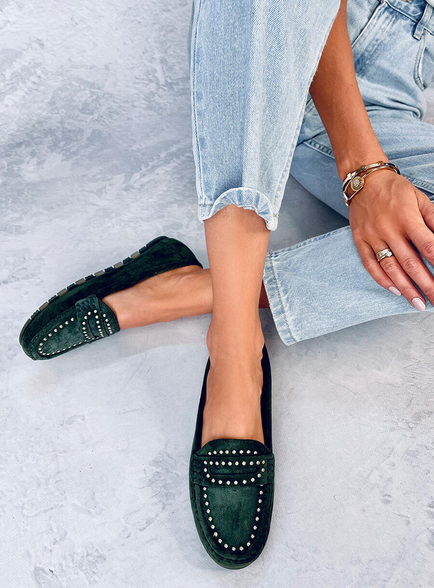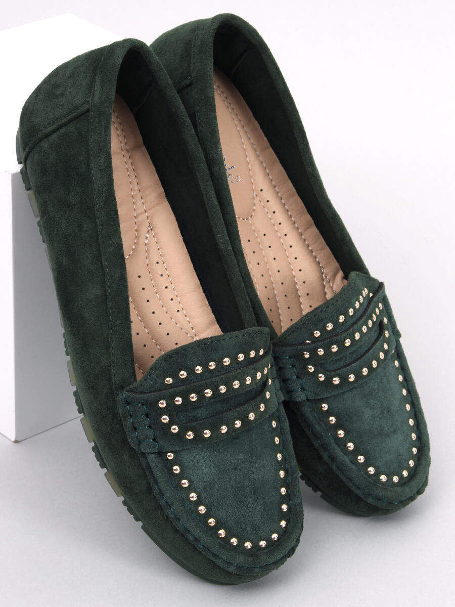 Zamszowe mokasyny damskie. Mają ponadczasowy fason z subtelnymi ćwiekami, które tworzą niepowtarzalny wzór. Mokasyny cieszą się ogromną popularnością wśród wielbicielek wygody – mięciutka wkładka wewnętrzna z poduszeczką zapewni komfort na każdym kroku. Materiał zewnętrzny - zamsz ekologiczny.