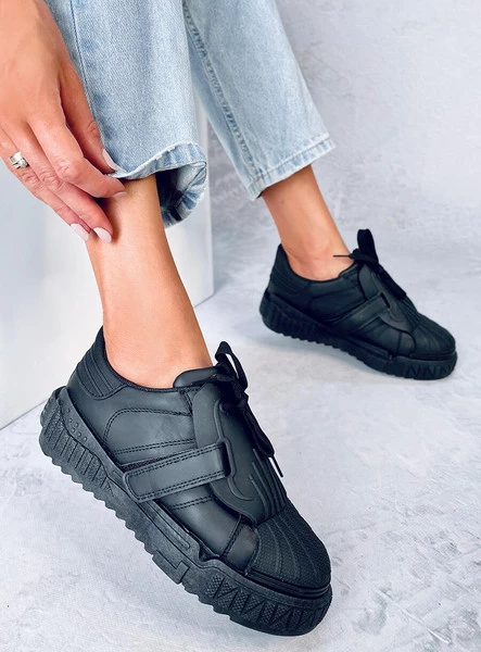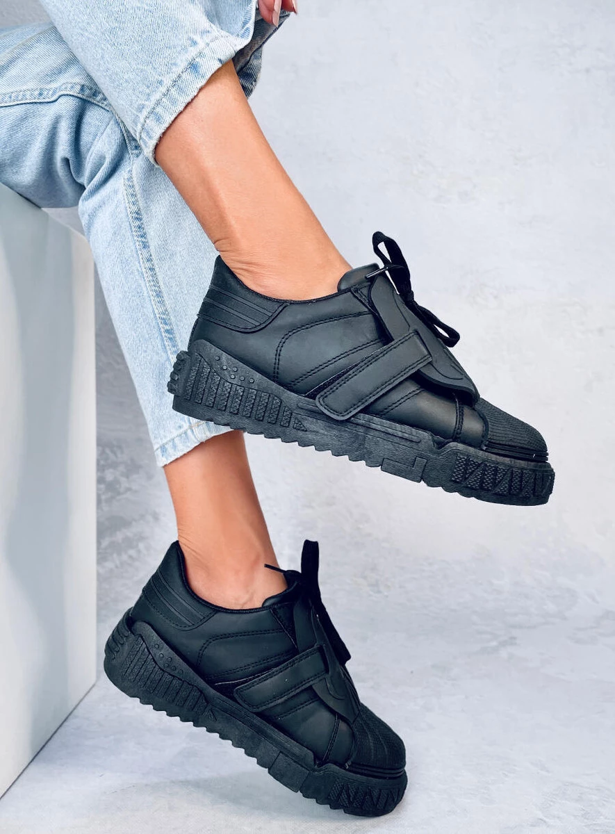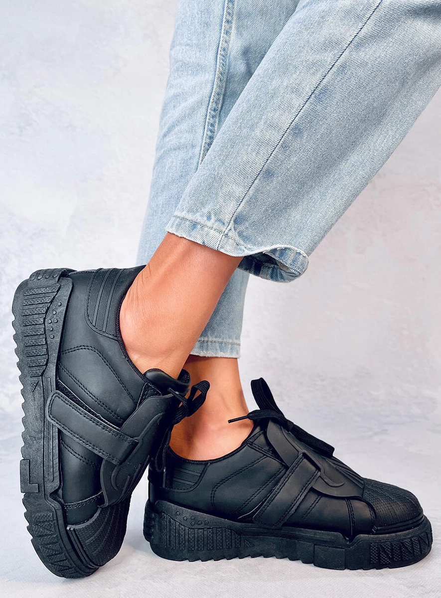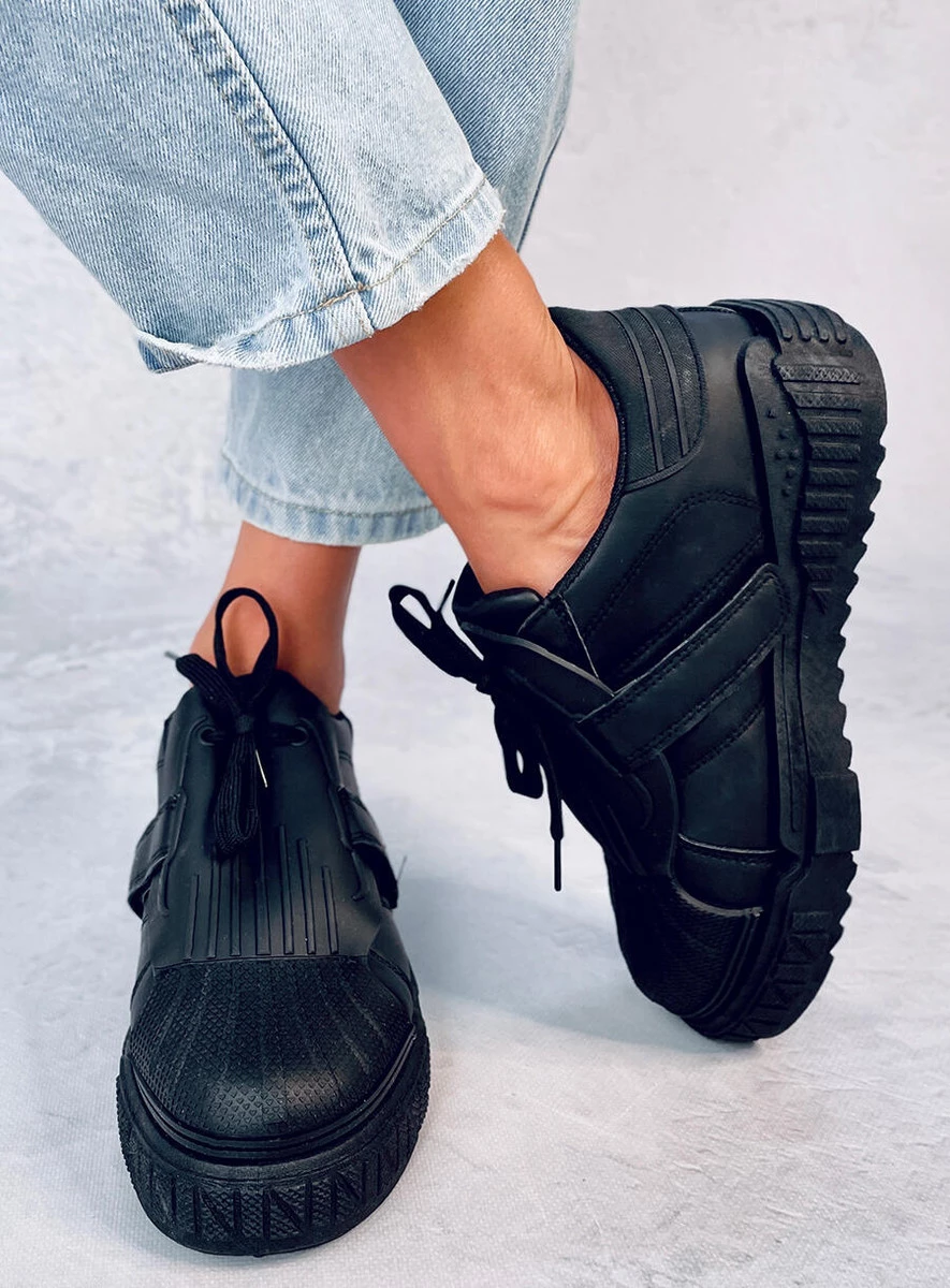 Szałowe trampki damskie sznurowane. Model o oryginalnym designie na wysokiej podeszwie musi obowiązkowo znaleźć się w każdej szafie : ) W tych butach będziesz wyglądała i czuła się świetnie - przekonaj się o tym sama : ) Wnętrze wyścielone jest tkaniną. Materiał zewnętrzny – skóra ekologiczna.