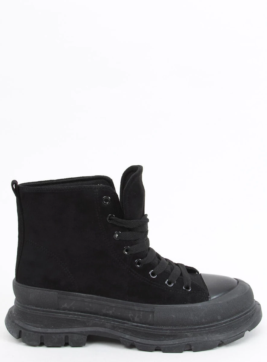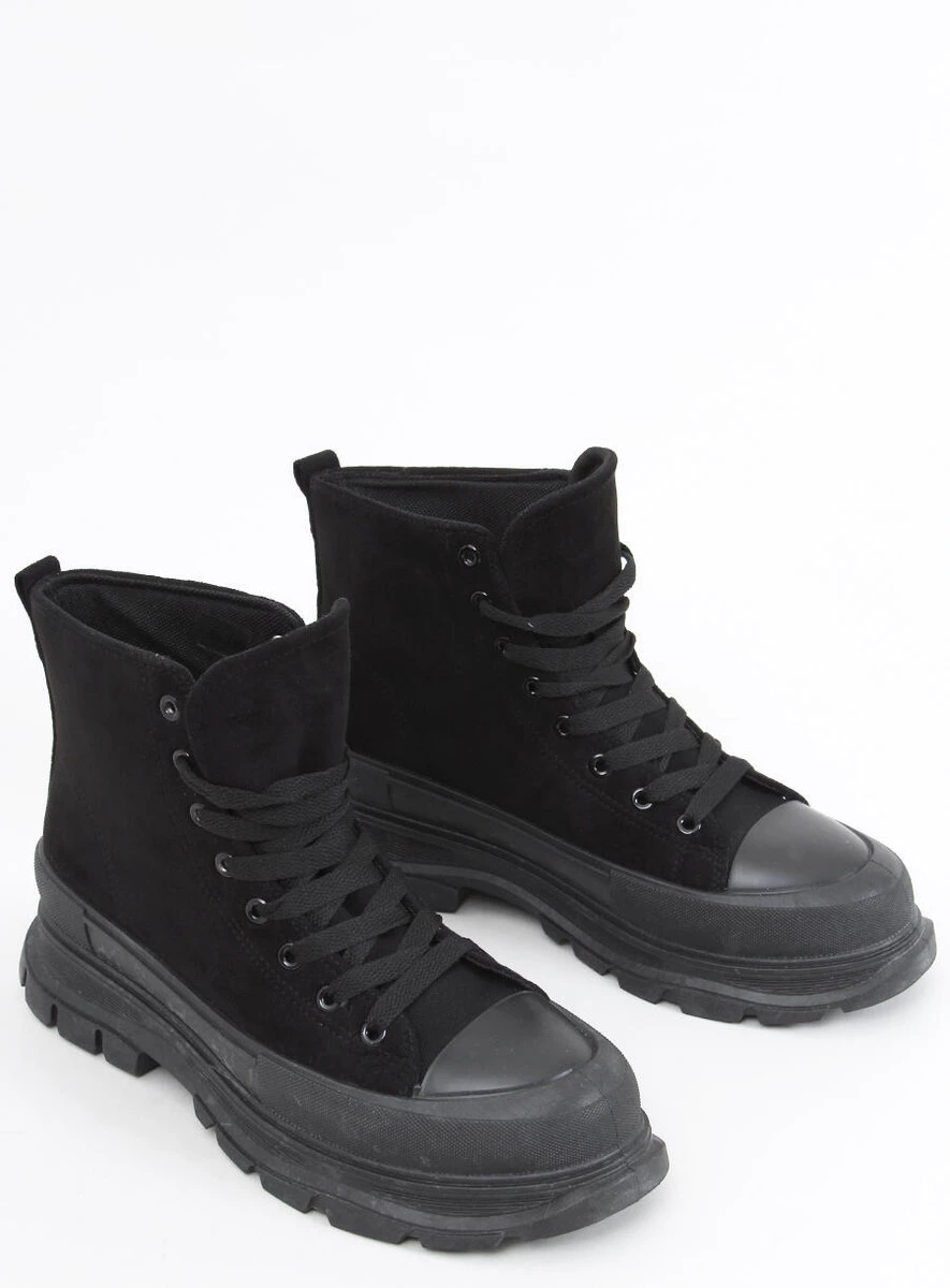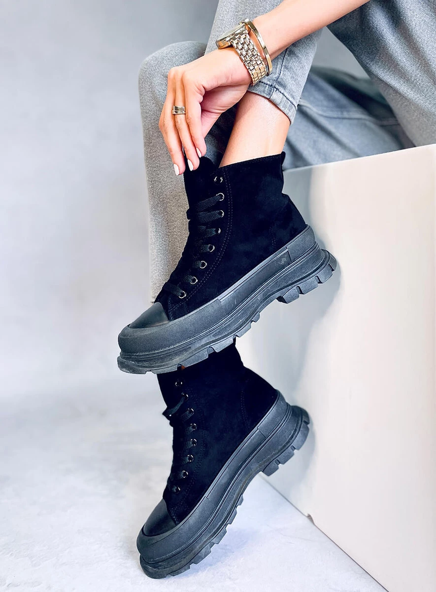 Sznurowane trampki damskie za kostkę. Mają ponadczasowy fason na najmodniejszej, wysokiej podeszwie - 5,5 cm. Koniecznie przygarnij je do swojej szafy : ) Wykonane są z bardzo miłego w dotyku zamszu ekologicznego, a wnętrze wyścielone jest tkaniną.
