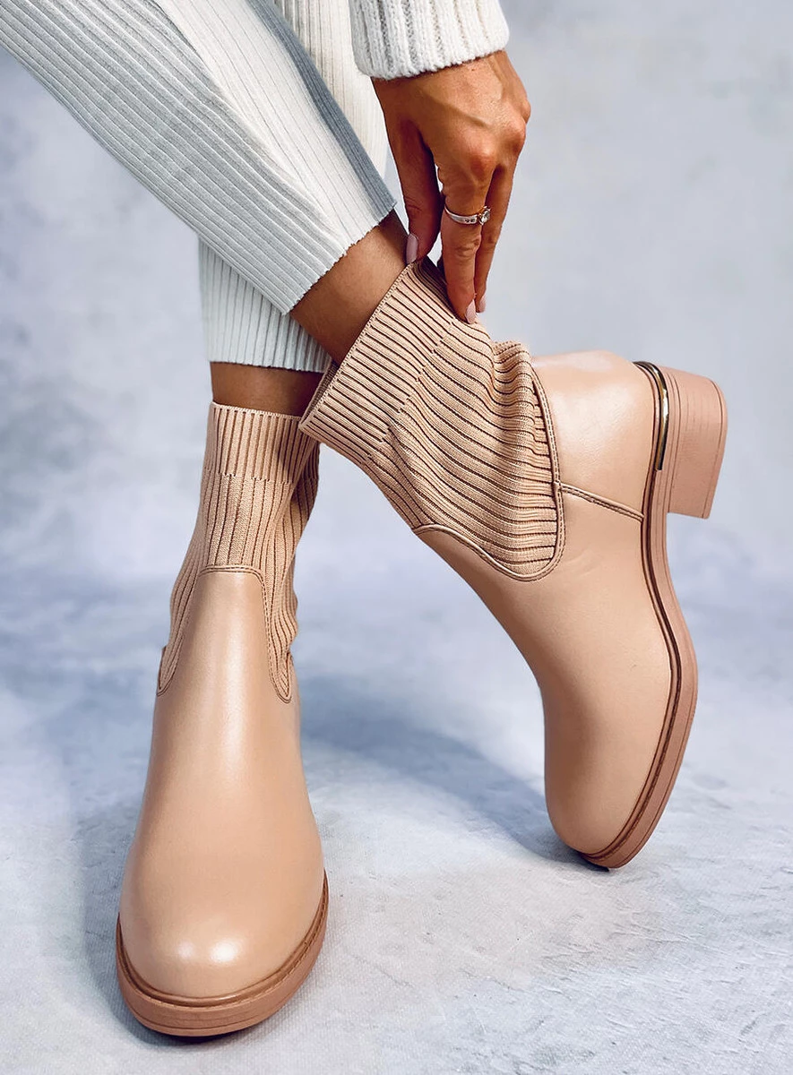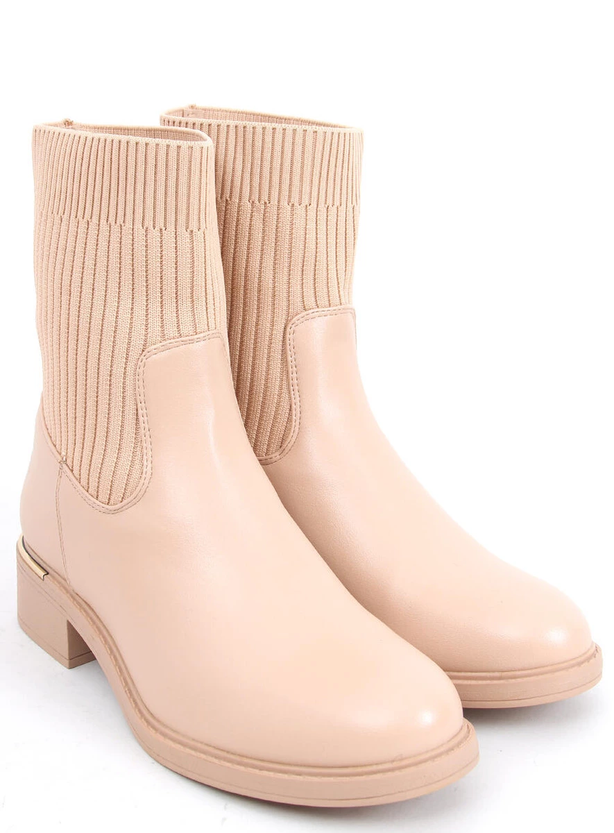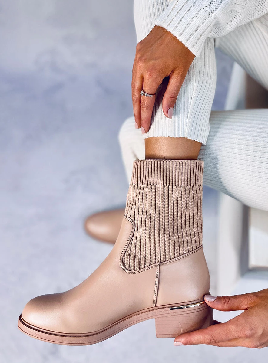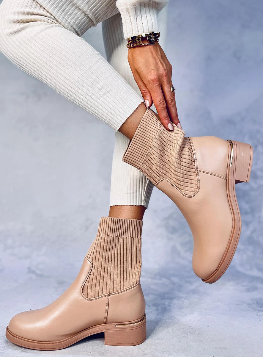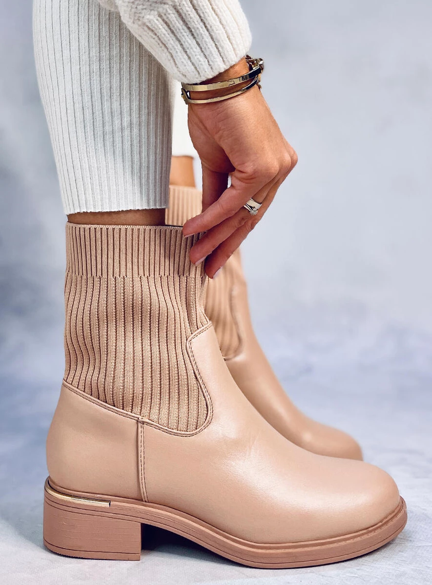 Botki damskie na płaskiej podeszwie. Cholewka wykonana jest z najmodniejszej, skarpetkowej tkaniny, dzięki czemu idealnie dopasowuje się do nogi, a zakładanie butów nie sprawia problemu. To absolutny must have, więc nie czekaj i zamów je już dziś : ) Materiał zewnętrzny - skóra ekologiczna + tkanina.