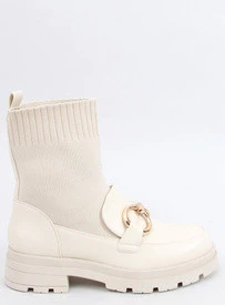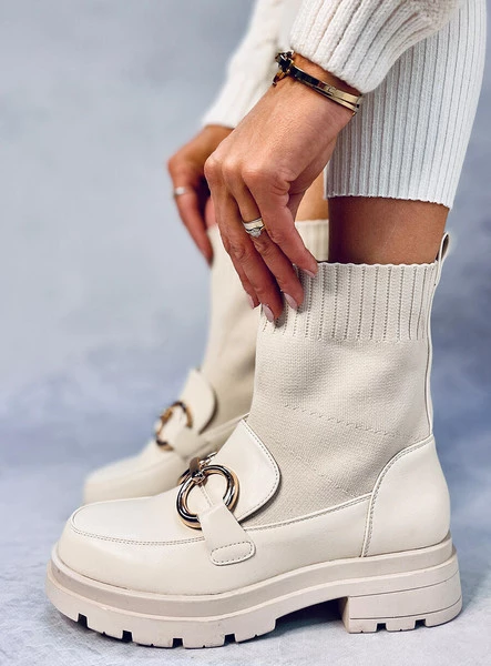 Botki damskie na grubej podeszwie. Cholewka wykonana jest z najmodniejszej, skarpetkowej tkaniny, dzięki czemu idealnie dopasowuje się do nogi, a zakładanie butów nie sprawia problemu. Złota ozdoba z przodu to ich znak charakterystyczny... Chyba już wiesz, które buty będą królowały w Twojej garderobie? : ) Materiał zewnętrzny - skóra ekologiczna + tkanina.