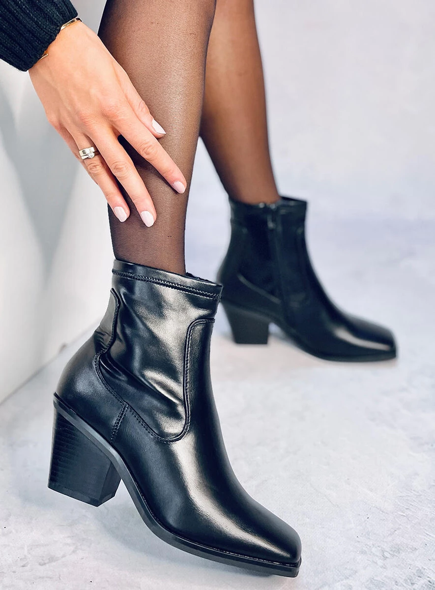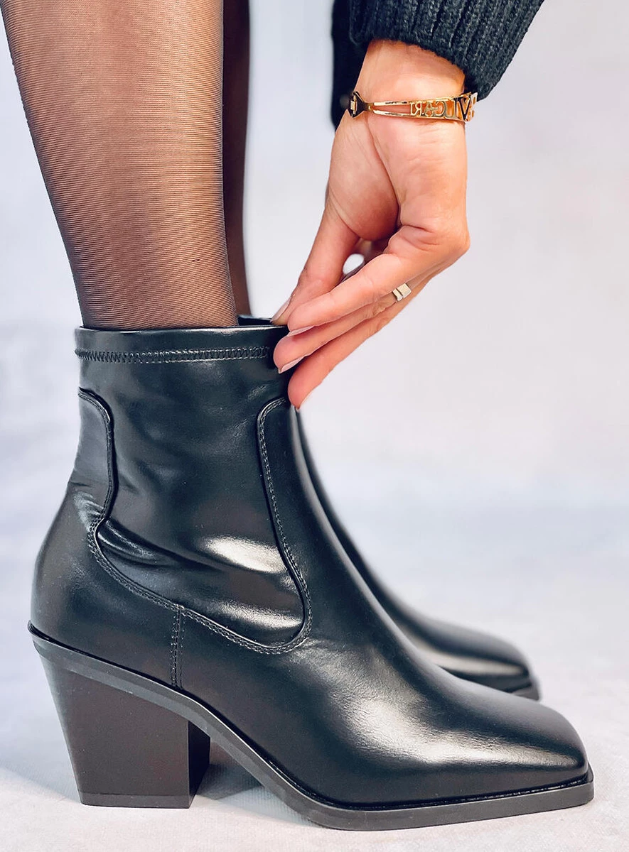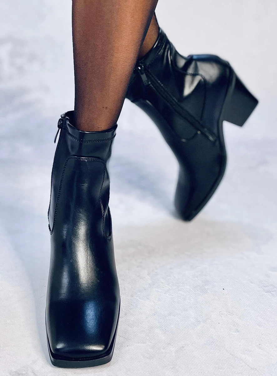 Licowe botki damskie z kwadratowymi noskami. Ich prosty fason pięknie współgra z szerokim obcasem o wysokości 7 cm... Jeśli chcesz wyglądać wyjątkowo to musisz je mieć : ) Praktyczne zapięcie na zamek z boku cholewki to ich niewątpliwa zaleta. Wykonane są ze skóry ekologicznej, na piankowym podszyciu.