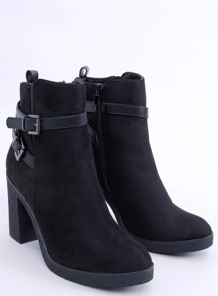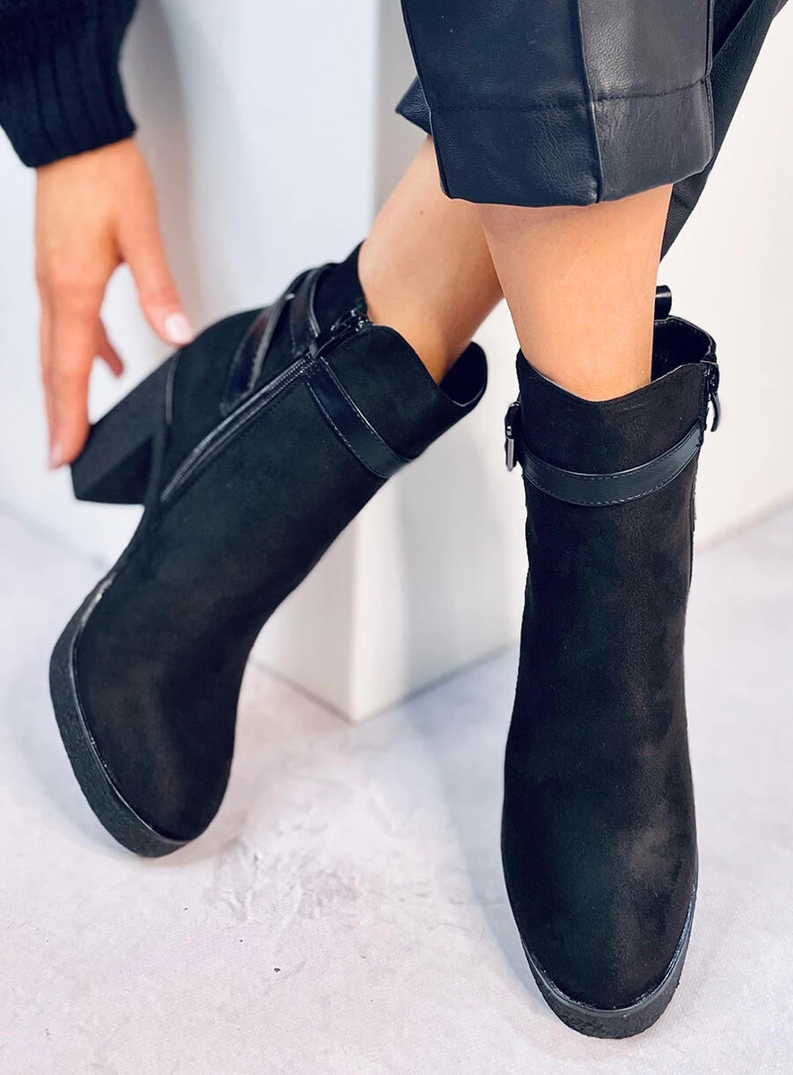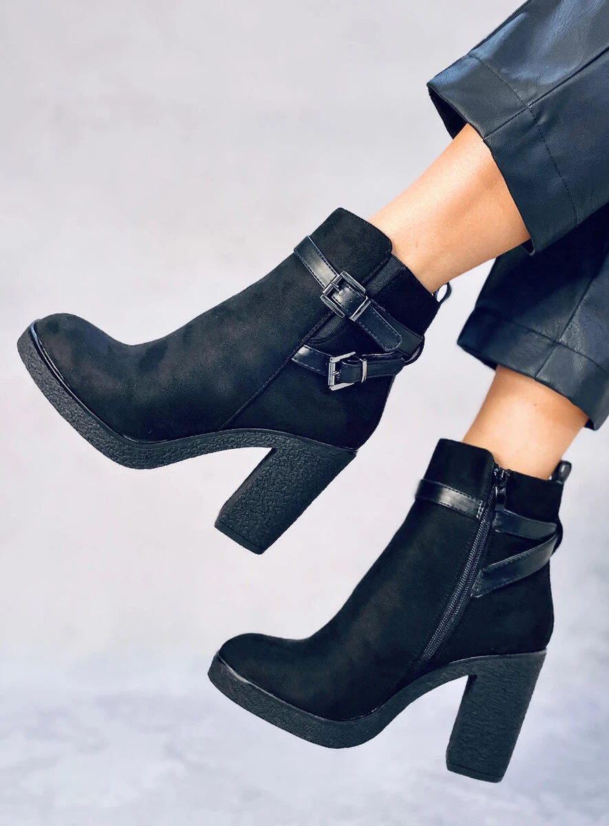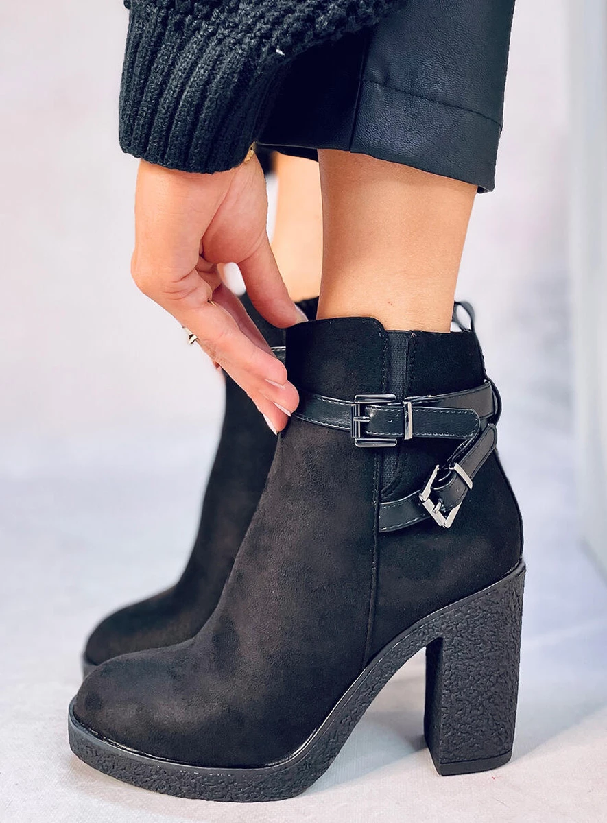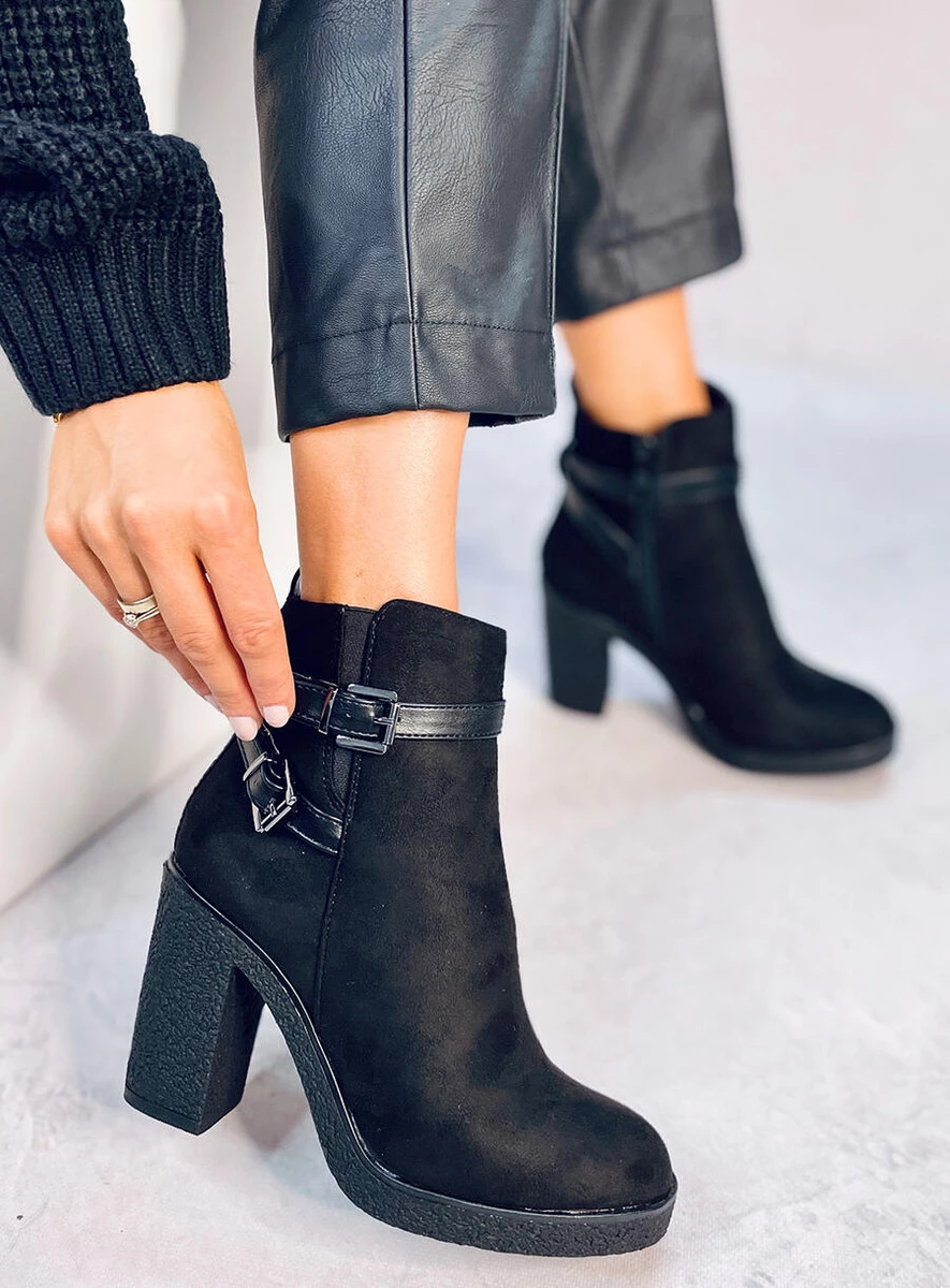 Botki damskie na obcasie o wysokości 9,5 cm. Ten wyjątkowy model ma ponadczasowy design z subtelnymi paskami, które zgrabnie oplatają kostkę... Dzięki nim stworzysz doskonały jesienny look! Praktyczny zamek z boku ułatwi Ci natomiast zakładanie... Materiał zewnętrzny – zamsz ekologiczny + skóra ekologiczna.