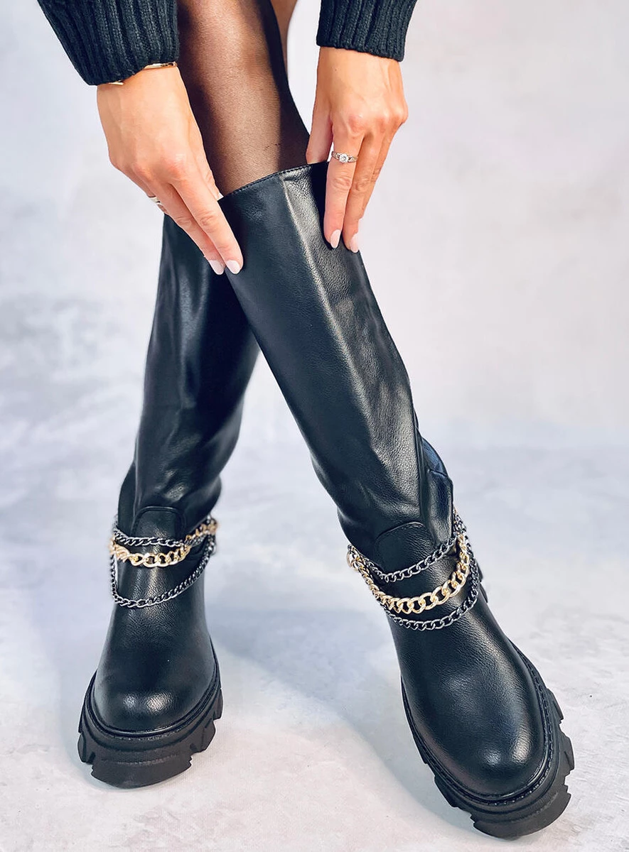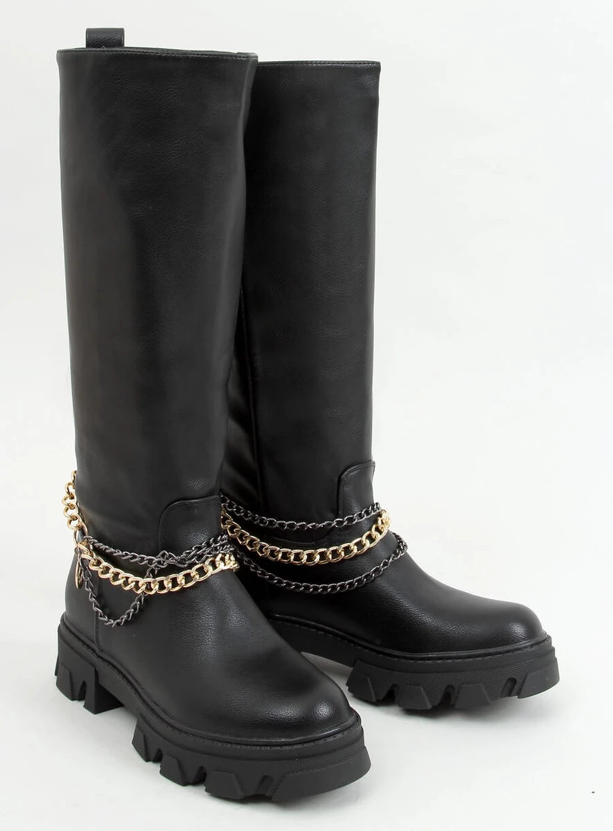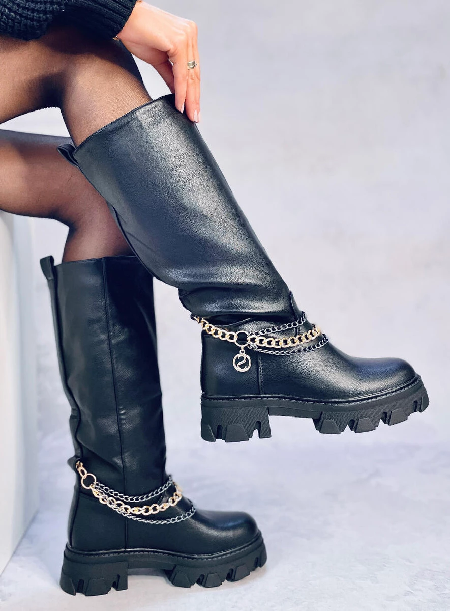 Kozaki damskie o kroju oficerek na designerskiej podeszwie. Unikalny fason tych butów został podkreślony przez najmodniejsze łańcuszki, które oplatają kostkę (możliwość ich odczepienia). Nieważne co założysz, bo te buty zawsze będą grały pierwsze skrzypce! Model wsuwany, bez suwaka z boku. Wykonane są ze skóry ekologicznej, a wnętrze wyścielone jest delikatnym futerkiem.