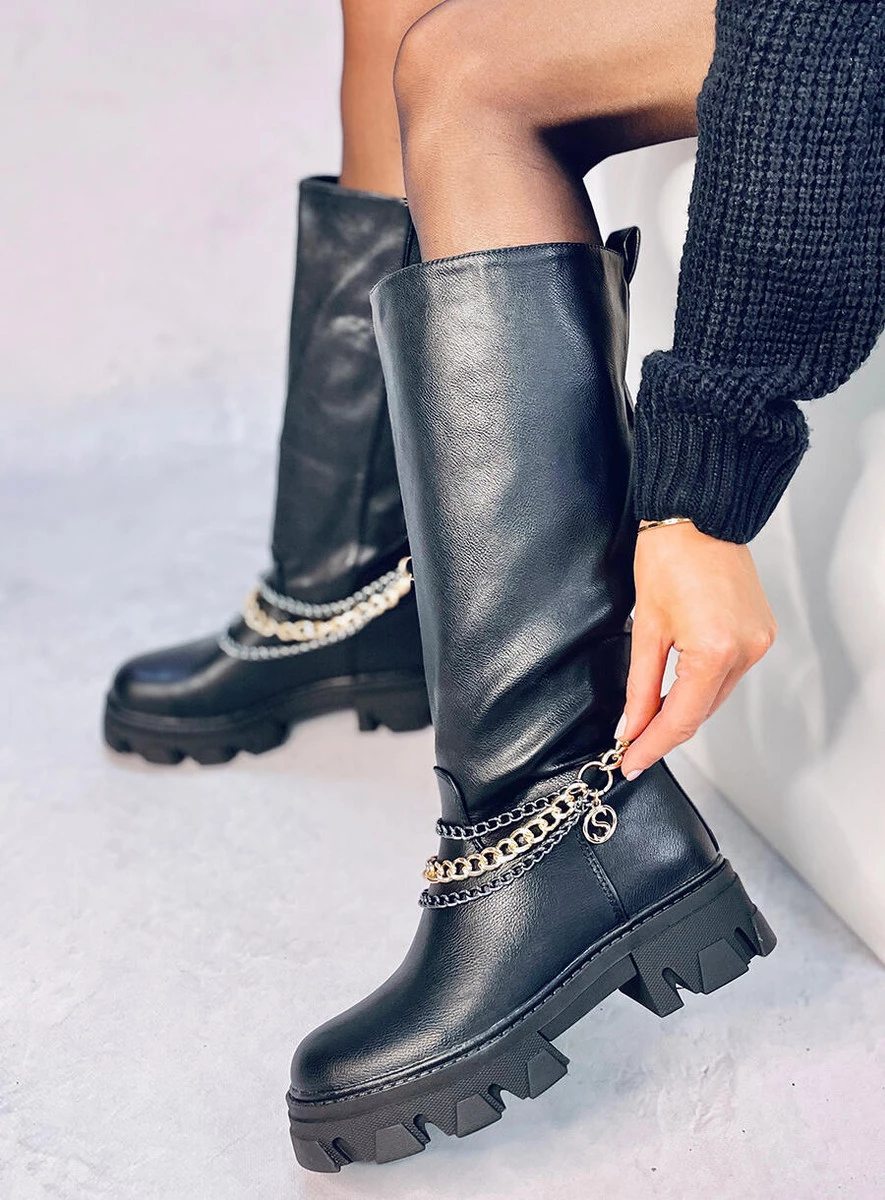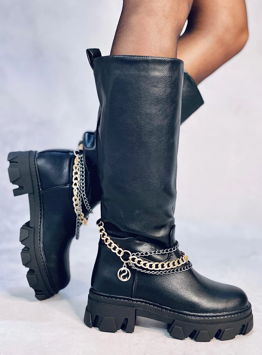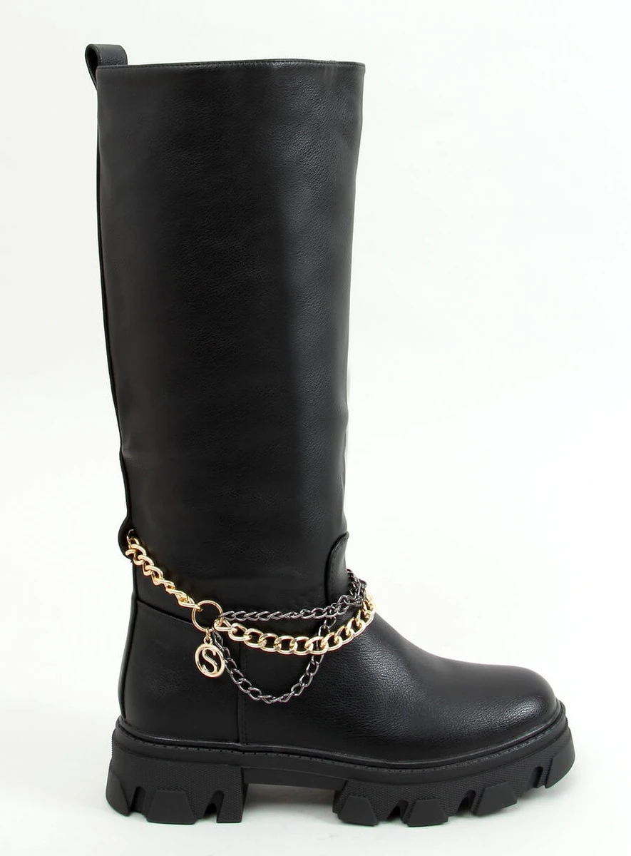 Kozaki damskie o kroju oficerek na designerskiej podeszwie. Unikalny fason tych butów został podkreślony przez najmodniejsze łańcuszki, które oplatają kostkę (możliwość ich odczepienia). Nieważne co założysz, bo te buty zawsze będą grały pierwsze skrzypce! Model wsuwany, bez suwaka z boku. Wykonane są ze skóry ekologicznej, a wnętrze wyścielone jest delikatnym futerkiem.