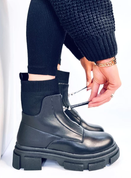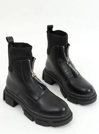 Botki damskie na grubej podeszwie. Model wyróżnia nietuzinkowa, skarpetkowa cholewka z efektownym srebrnym suwakiem z przodu. To absolutny hit tego sezonu! Nie dość, że świetnie wyglądają to jeszcze są bardzo wygodne - przekonaj się o tym sama : ) Model bez ocieplacza. Materiał zewnętrzny - skóra ekologiczna + tkanina.