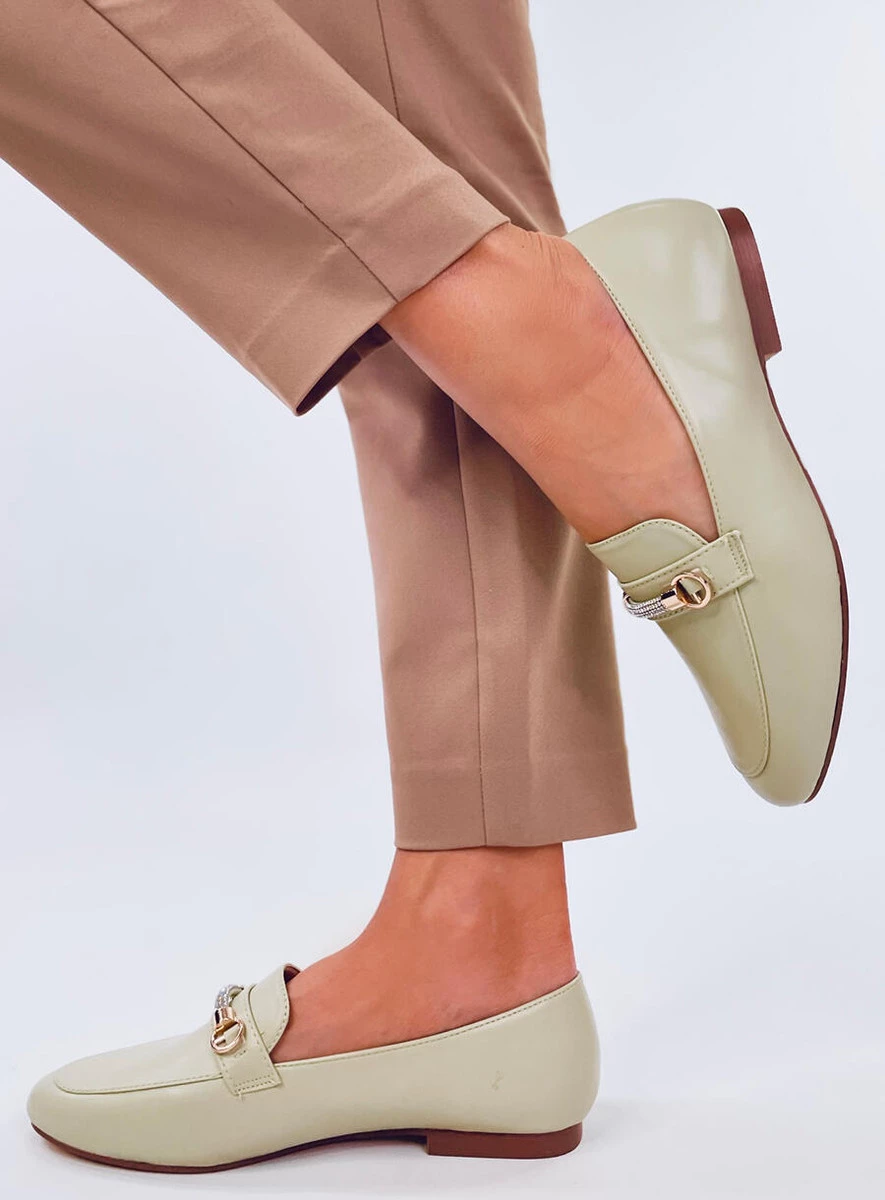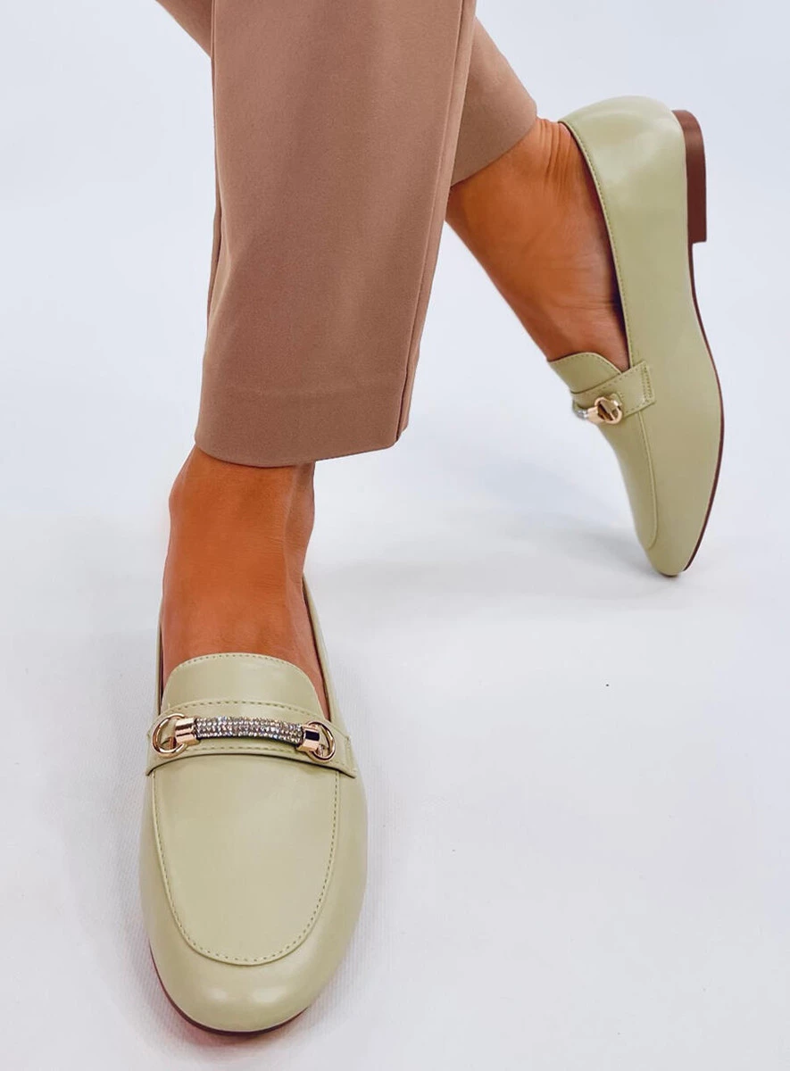 Stylowe mokasyny damskie. Błyszcząca aplikacja z cyrkoniami podkreśla zgrabny fason tego modelu, a dodatkowo przyciągnie wszystkie spojrzenia. To buty, które wyglądają modnie i szykowanie, a przy tym są bardzo wygodne... Nie daj się namawiać! Wykonane są ze skóry ekologicznej.