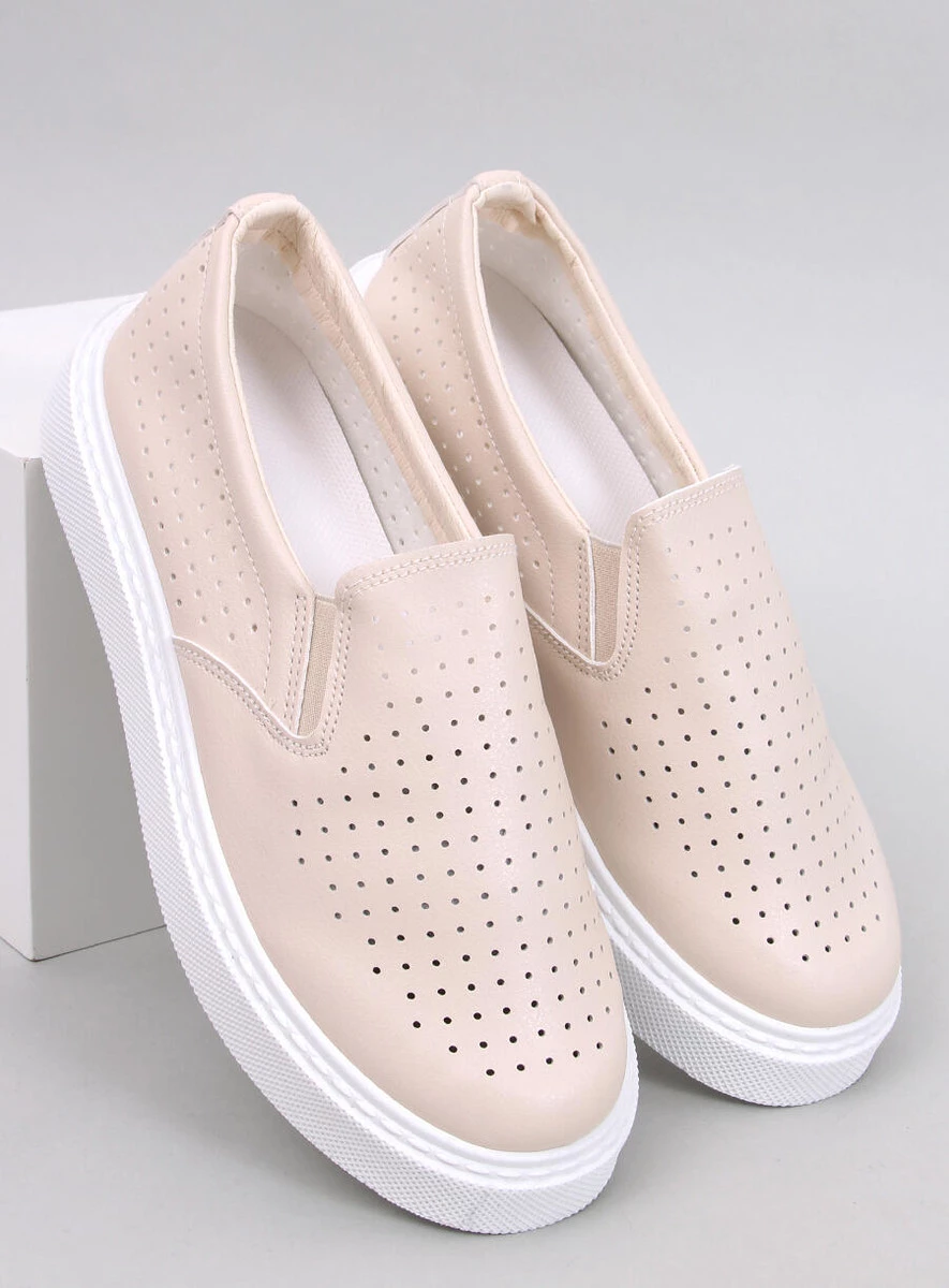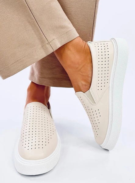 Ażurowe trampki damskie typu slip-on. Ten ponadczasowy model na wysokiej, białej podeszwie (2,5 cm) nigdy nie wyjdzie z mody! Wykonane są z delikatnej skóry ekologicznej o przewiewnym, ażurowym wzorze. Wkładka wewnętrzna – tkanina.