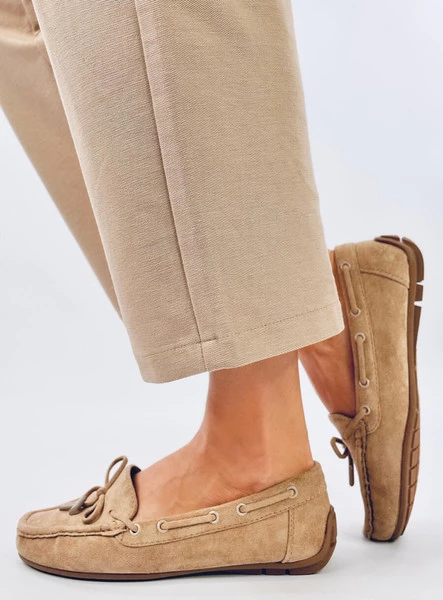 Klasyczne mokasyny damskie zamszowe. Model ma ponadczasowy fason z ozdobną kokardką i przeszyciami. Mokasyny cieszą się ogromną popularnością wśród wielbicielek wygody – mięciutka wkładka wewnętrzna z poduszeczką zapewni komfort na każdym kroku... Materiał zewnętrzny - zamsz ekologiczny.