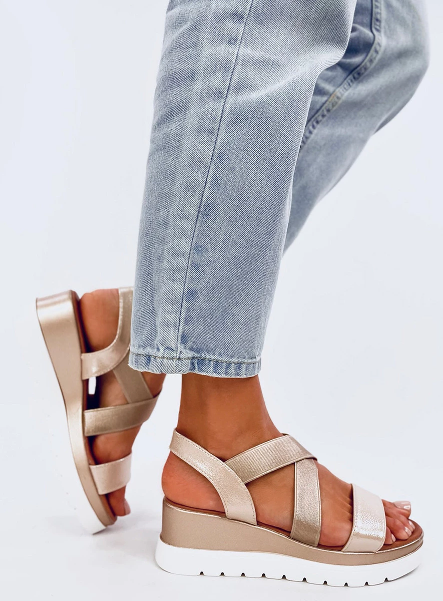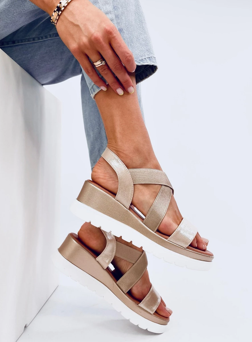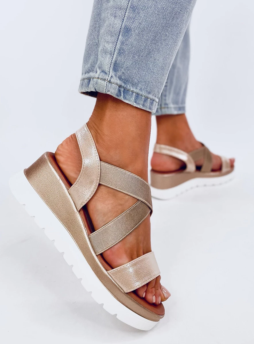 Metaliczne sandałki damskie na koturnie o wysokości 6 cm. Model jest wyjątkowo lekki i ma modną platformę o wysokości 3 cm, dzięki czemu cały dzień będziesz czuć się komfortowo. Te buty z pewności spełnią Twoje oczekiwania : ) Materiał zewnętrzny – skóra ekologiczna + guma.