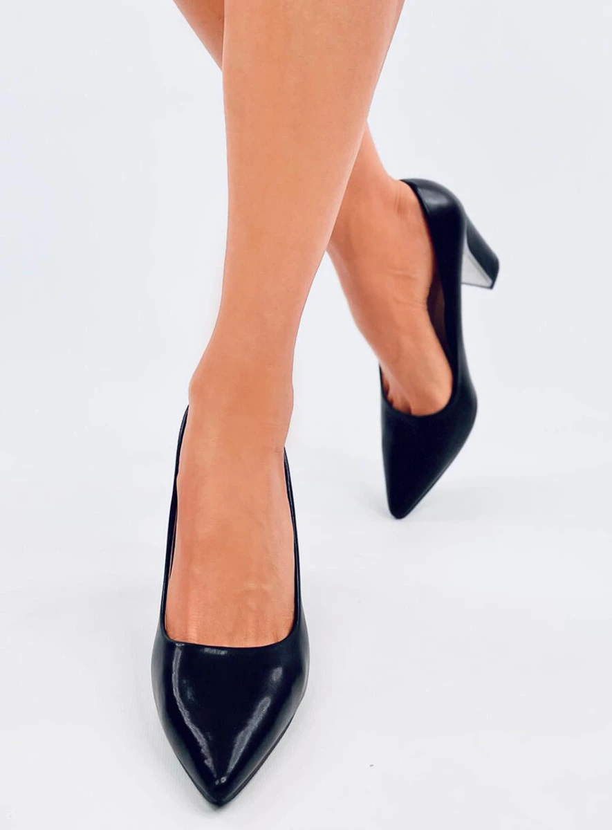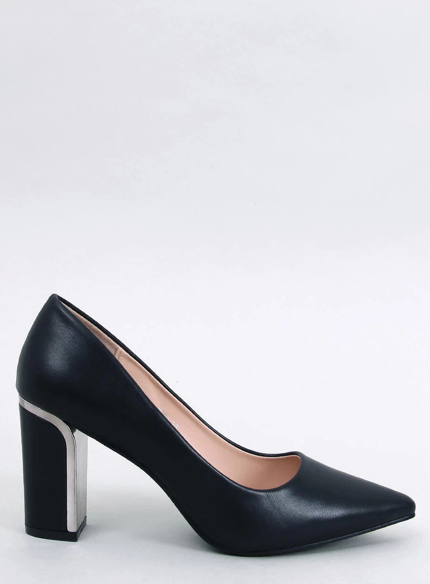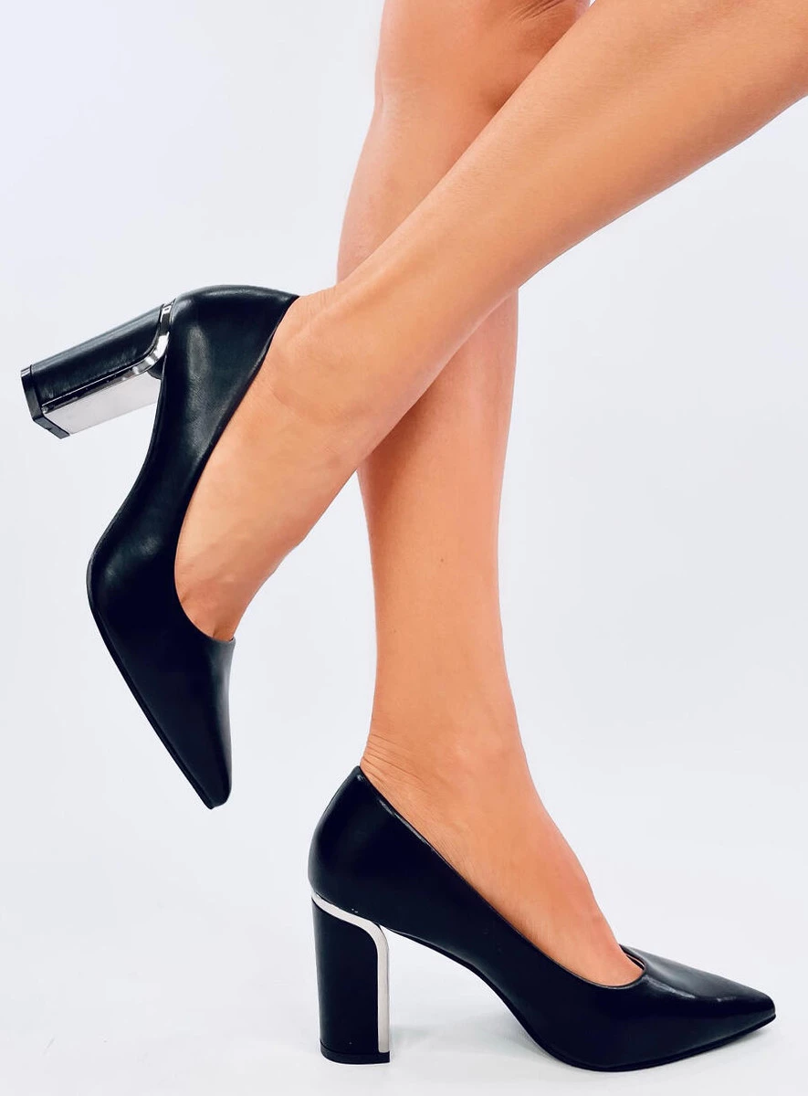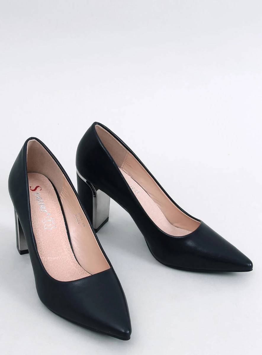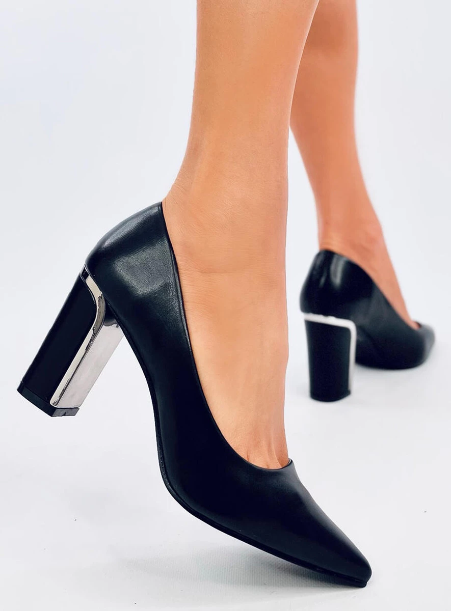 Licowe czółenka damskie na słupku o wysokości 8,5 cm. Ich zgrabny fason w połączeniu z metalicznymi wstawkami daje niepowtarzalny efekt... Przepięknie prezentują się na nodze! Jeśli chcesz wyglądać wyjątkowo i cieszyć się komfortem to musisz je mieć - mają wkładkę wewnętrzną ze skóry naturalnej : ) Materiał zewnętrzny - skóra ekologiczna.