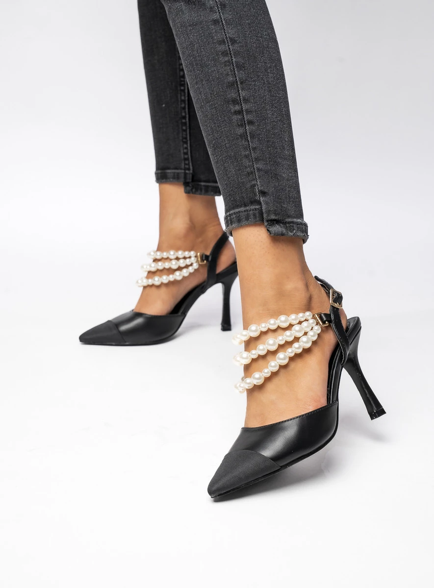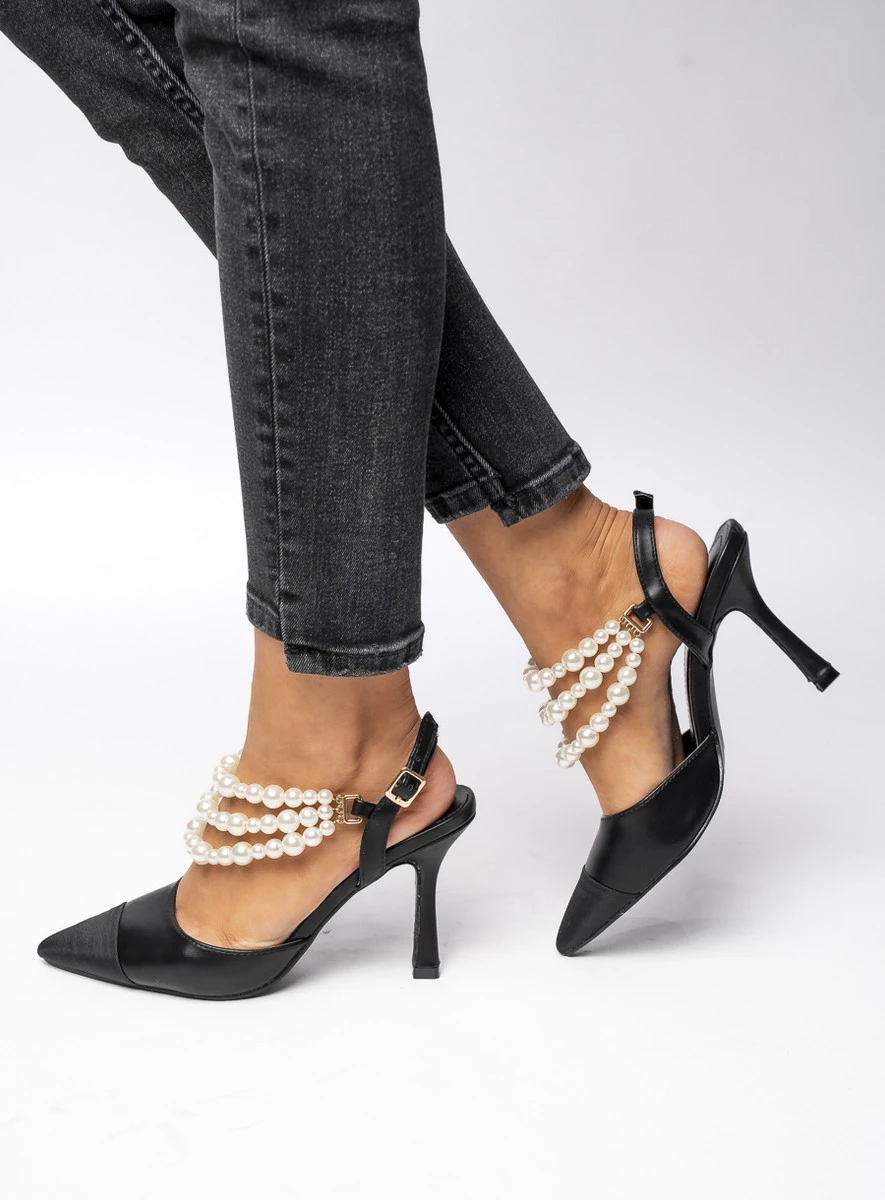 HARMONY BLACK to połączenie luksusu i klasyki w eleganckim wydaniu. Wyróżniają się subtelną konstrukcją, smukłym obcasem oraz zdobieniem w postaci delikatnych perełek, które oplatają kostkę, nadając całości wyjątkowego szyku. Idealne na wyjątkowe okazje, wieczorne wyjścia i eleganckie stylizacje.