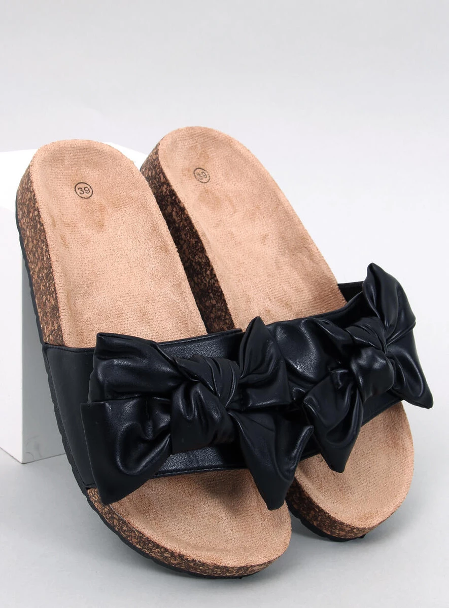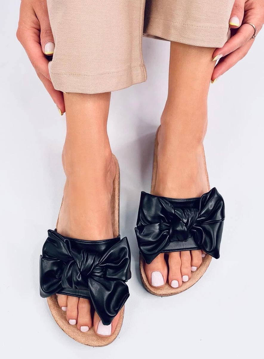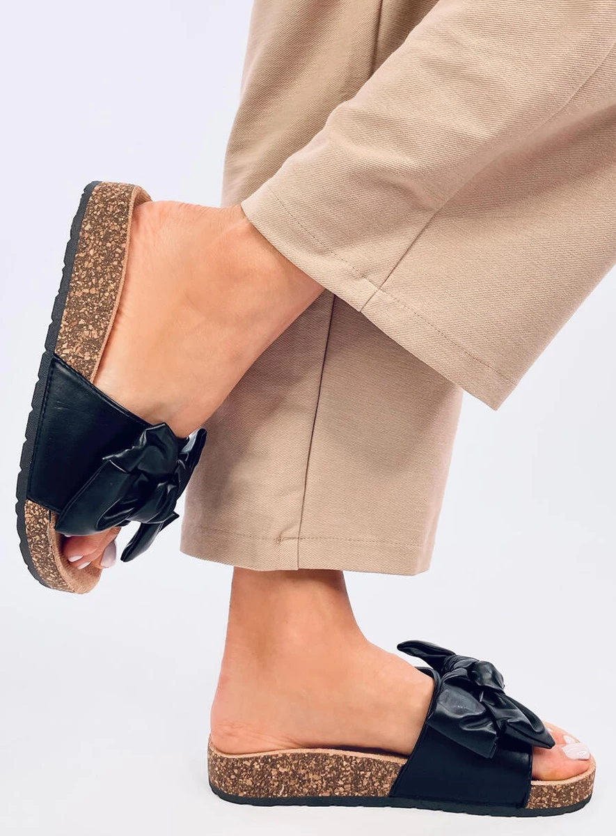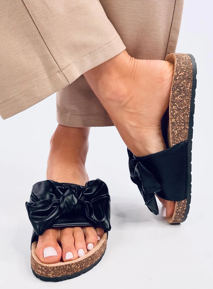 Klapki damskie na korkowej podeszwie. To wyjątkowy model z przeuroczą kokardą - zakochacie się w nich po uszy! Profilowana wkładka wyścielona delikatnym zamszem sprawi, że nie straszne będą długie spacery : ) Materiał zewnętrzny – skóra ekologiczna.