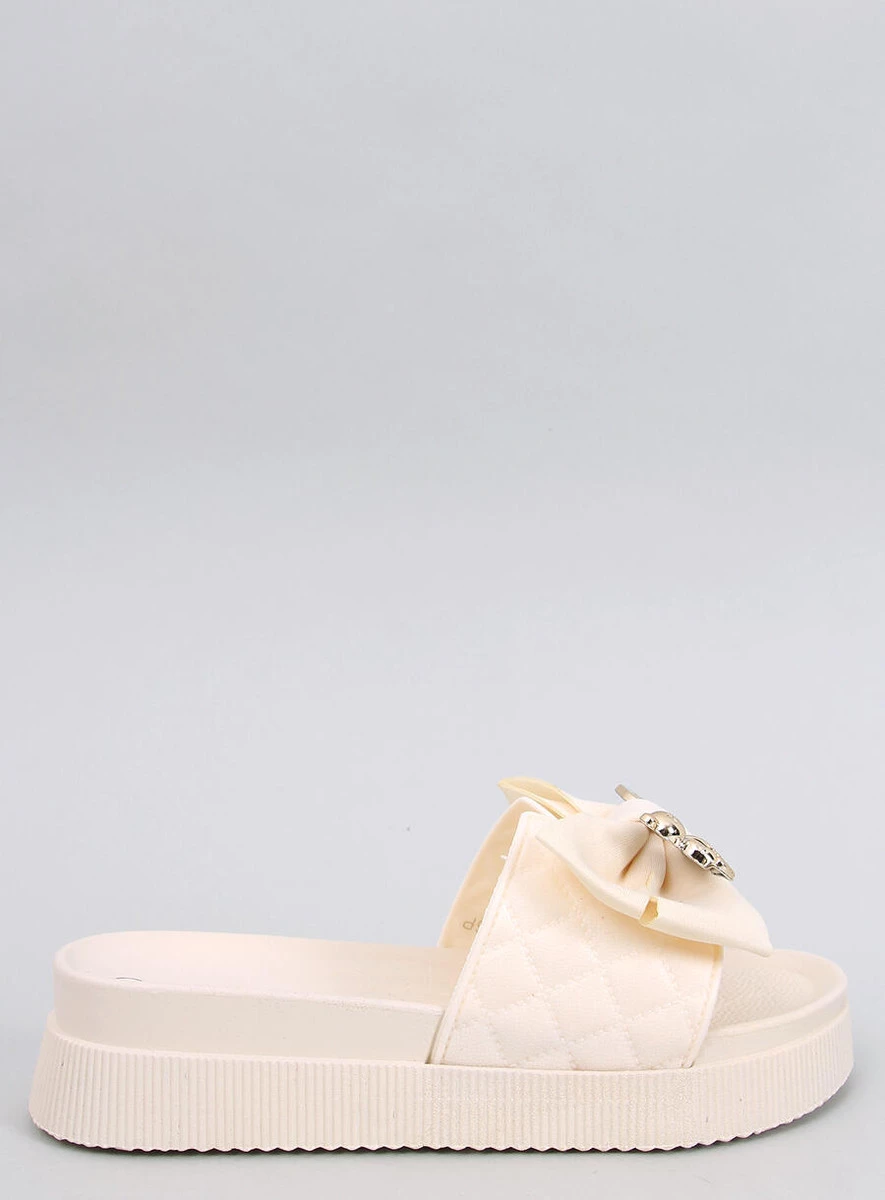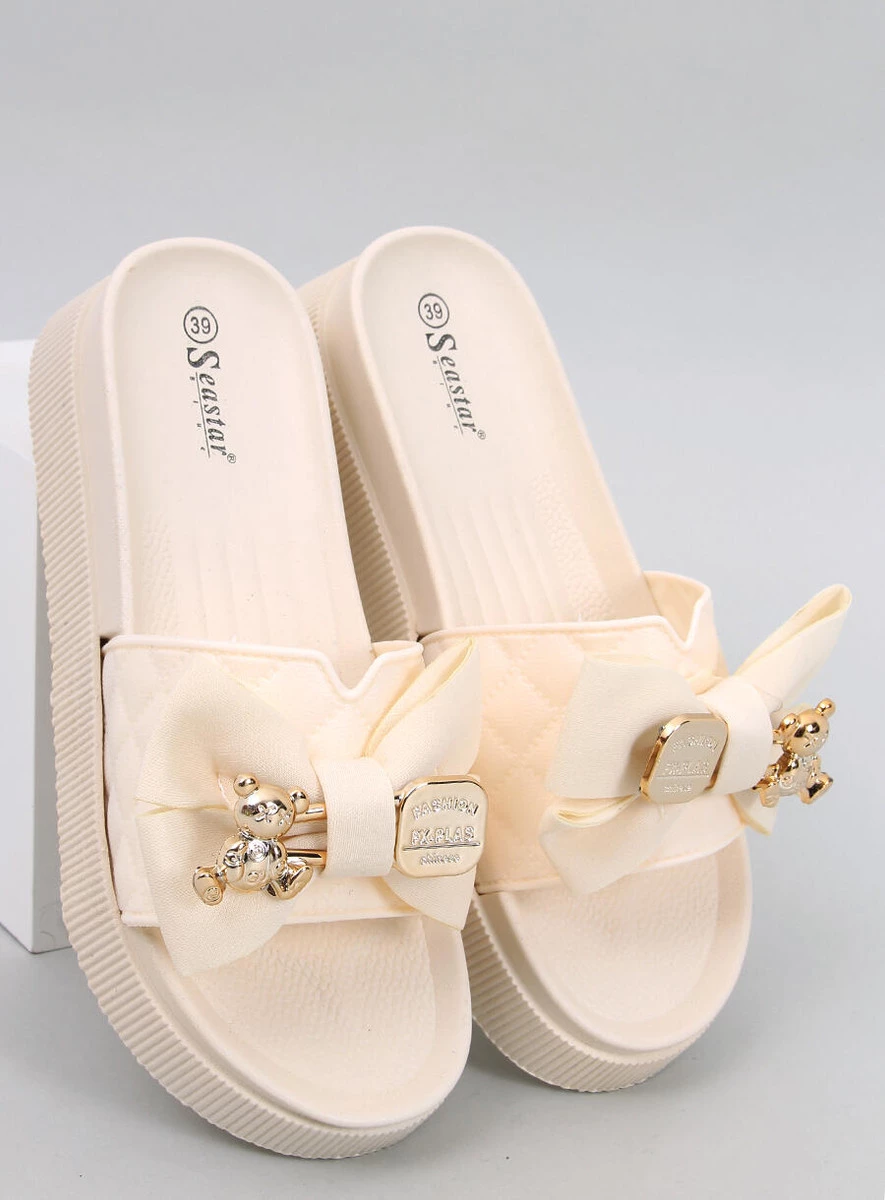 Pikowane klapki damskie na wysokiej podeszwie (4cm). Model wyróżnia przepiękna kokarda, która została urozmaicona stylową agrafką oraz uroczym, złotym misiem. Na pewno skradną Wasze serca : ) Profilowana wkładka wewnętrzna zapewni wygodę na każdym kroku. Materiał zewnętrzny – skóra ekologiczna + tkanina + guma.