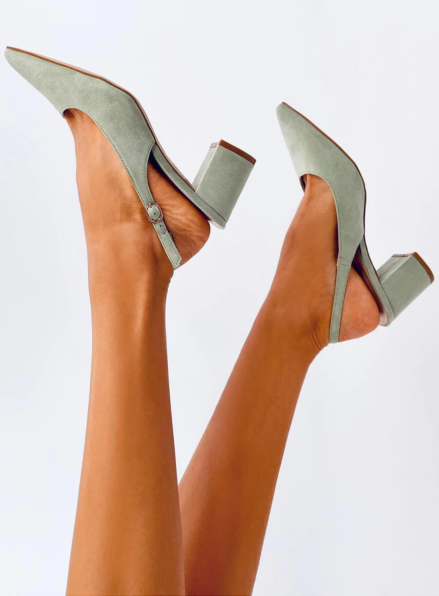 Zamszowe czółenka damskie z odkrytą piętą. Mają zgrabny fason ze zwężającymi się noskami... Obcas o wysokości 7 cm wysmukli Twoją sylwetkę, a także zapewni komfort na każdym kroku.... Idealny wybór na specjalne okazje - studniówkę czy wesele. Materiał zewnętrzny – zamsz ekologiczny.