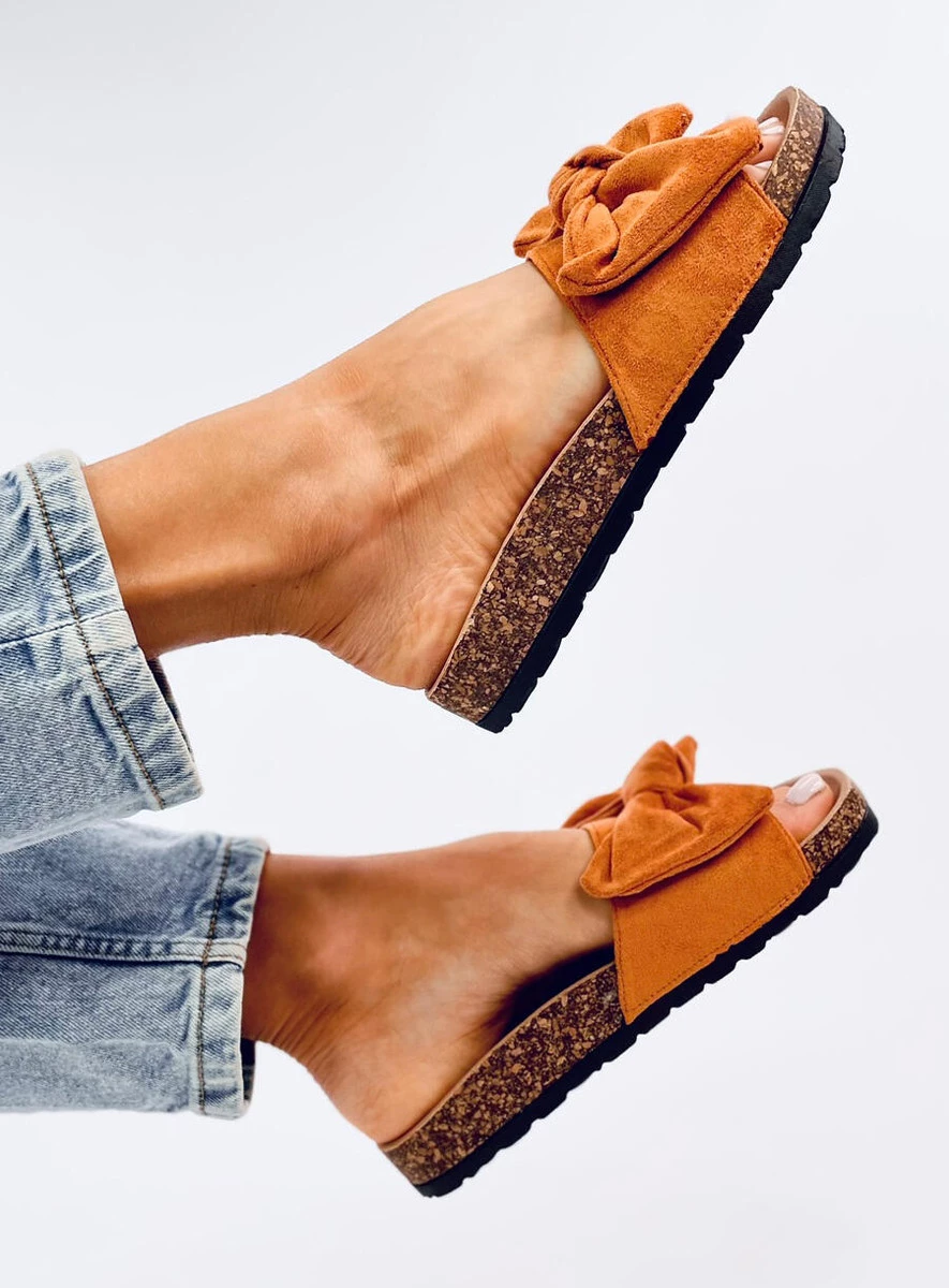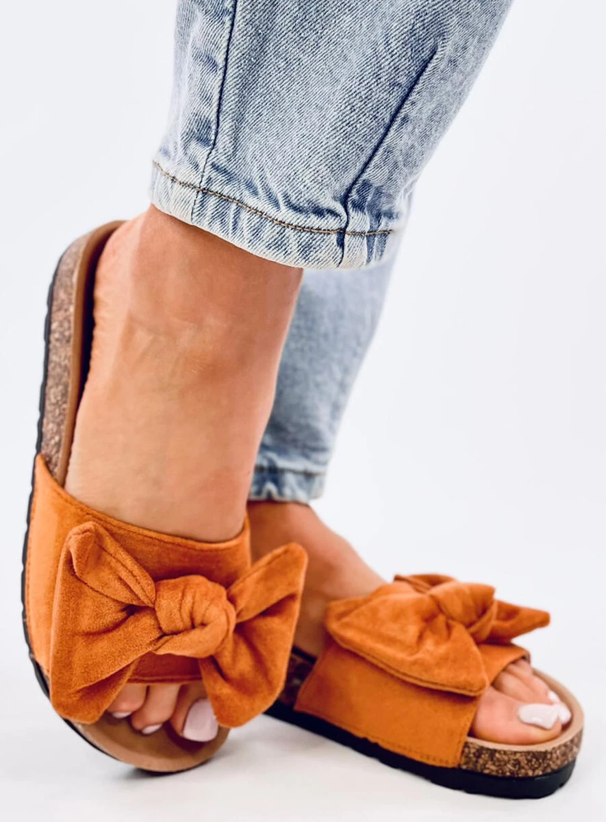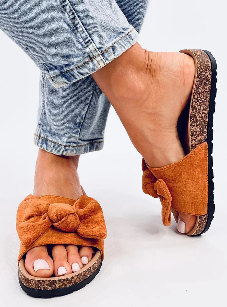 Korkowe klapki damskie. To kultowy model z subtelną i urokliwą kokardą... Profilowana wkładka sprawi, że nie straszne będą długie spacery : ) Z pewnością spełnią Twoje oczekiwania i staną się Twoją ulubioną parą butów na lato! Materiał zewnętrzny – zamsz ekologiczny.