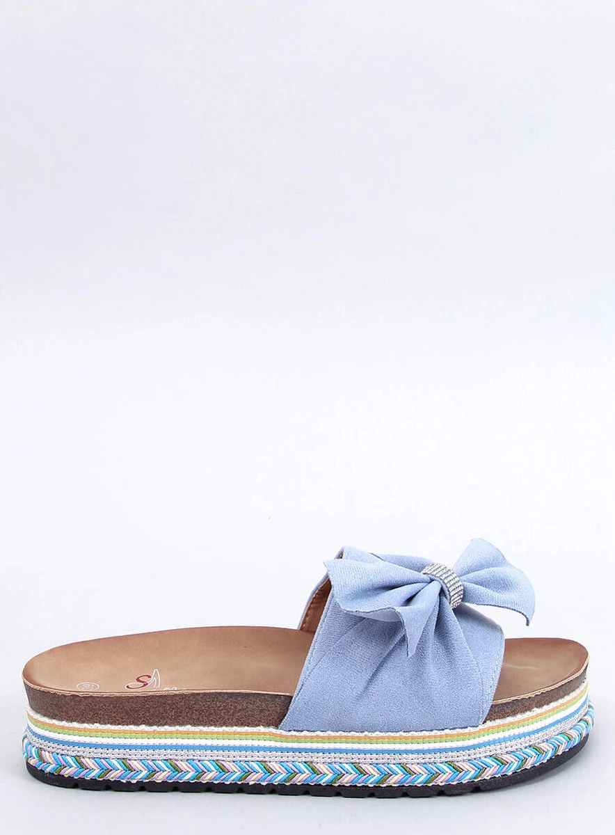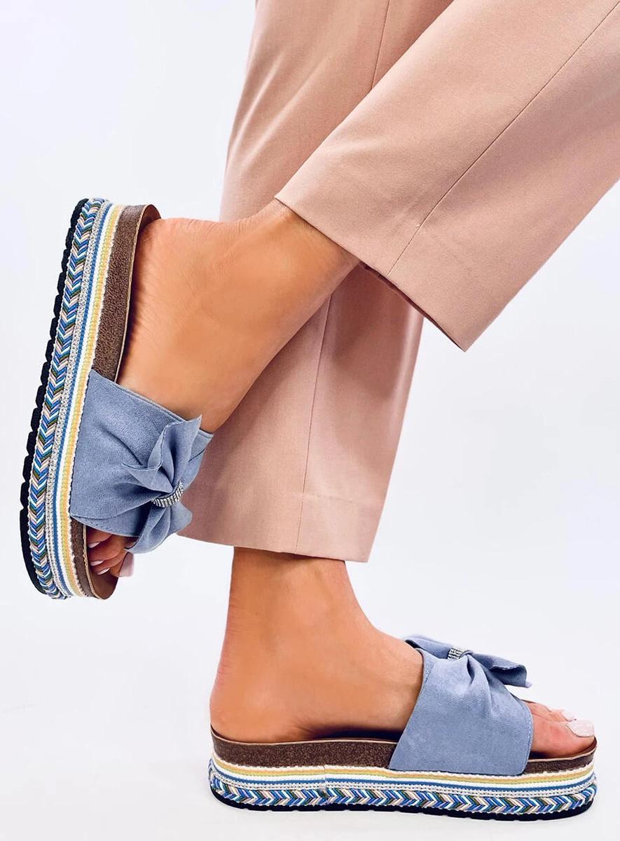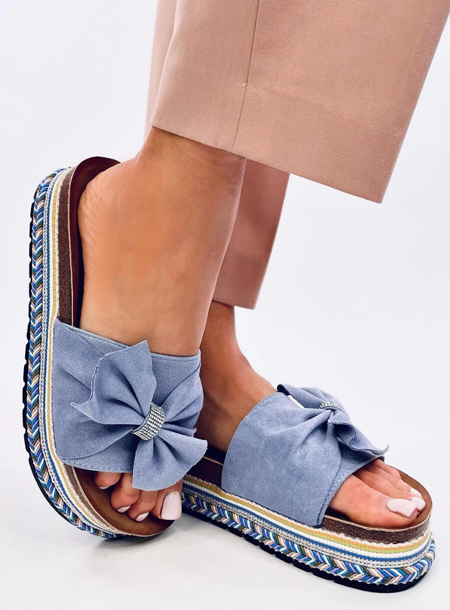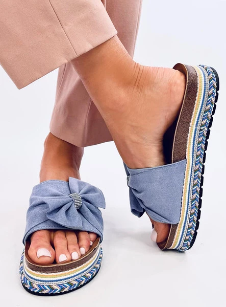 Klapki damskie na platformie - 4 cm. To absolutnie najmodniejszy fason na zdobionej podeszwie i z przepiękną kokardą oraz kamieniami... Profilowana wkładka sprawi, że nie straszne będą długie, letnie spacery : ) Gwarantujemy, że te klapki z pewnością staną się Twoją ulubioną parą butów na lato! Materiał zewnętrzny – zamsz ekologiczny.
