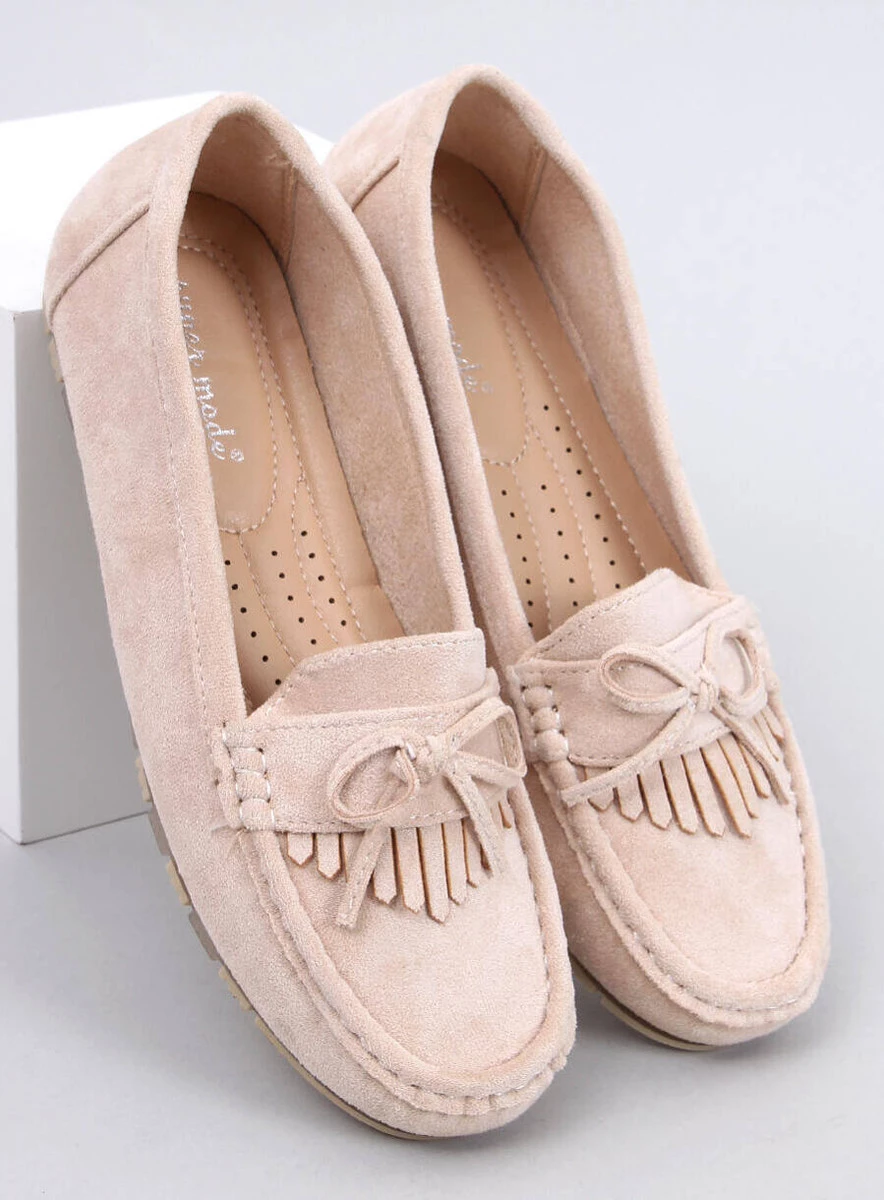 Zamszowe mokasyny damskie. Model ma klasyczny fason z ozdobną kokardką oraz frędzelkami. Mokasyny cieszą się ogromną popularnością wśród wielbicielek wygody – mięciutka wkładka wewnętrzna z poduszeczką zapewni komfort na każdym kroku... Materiał zewnętrzny - zamsz ekologiczny.