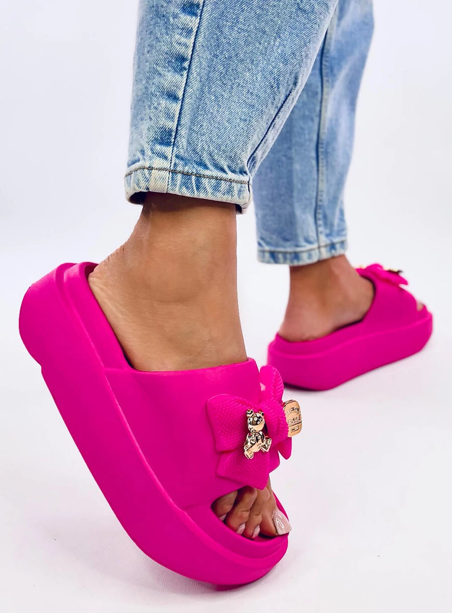 Klapki damskie na platformie. Kokarda z przeuroczym, złotym misiem na pewno skradnie Wasze serca : ) Ten wyjątkowy model to najwygodniejsze i najmodniejsze rozwiązanie na letnie dni... Nie czekaj i zamów je już dziś! Materiał zewnętrzny - tworzywo.