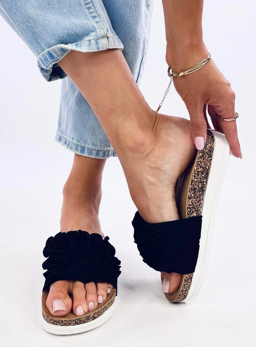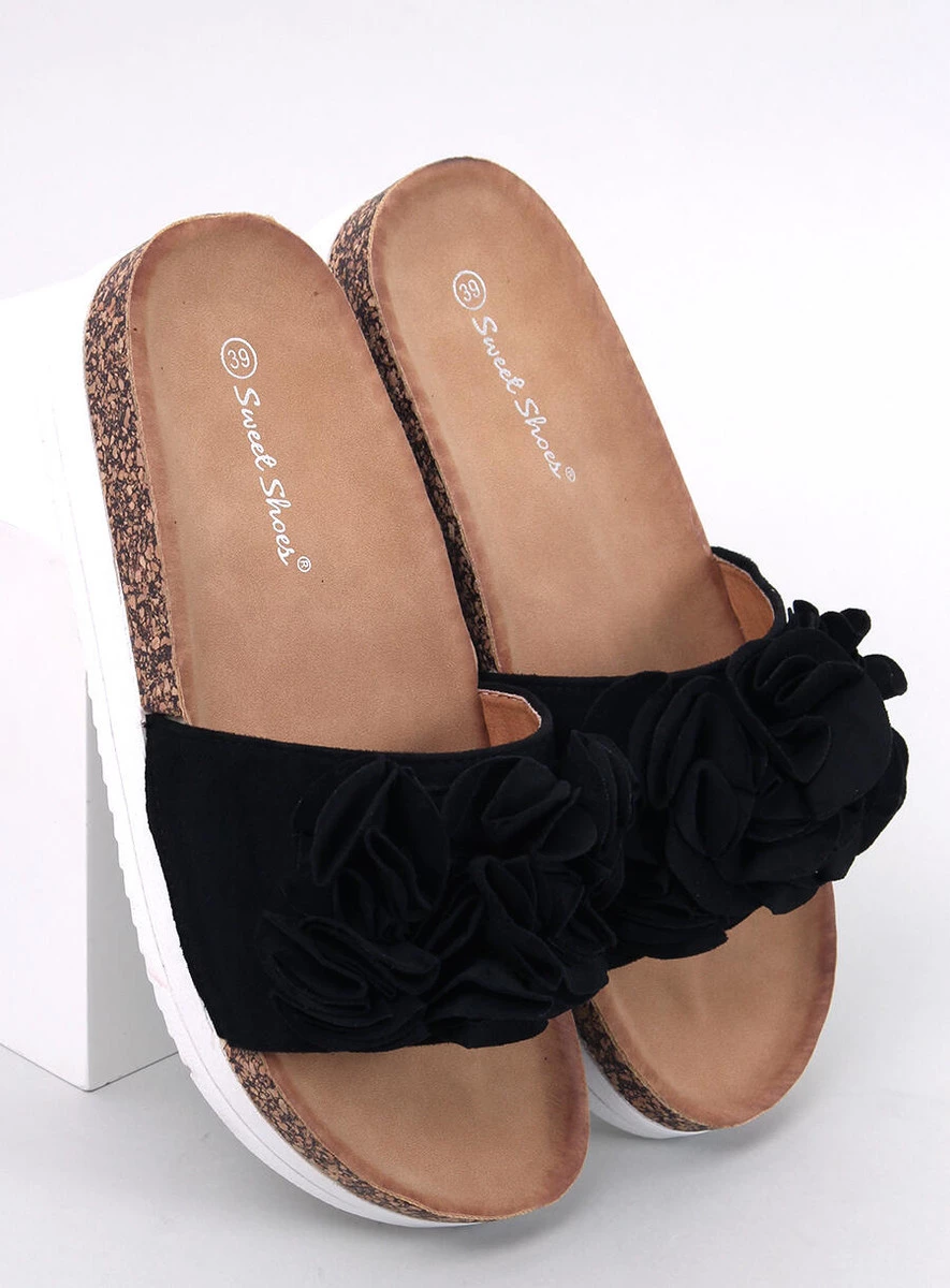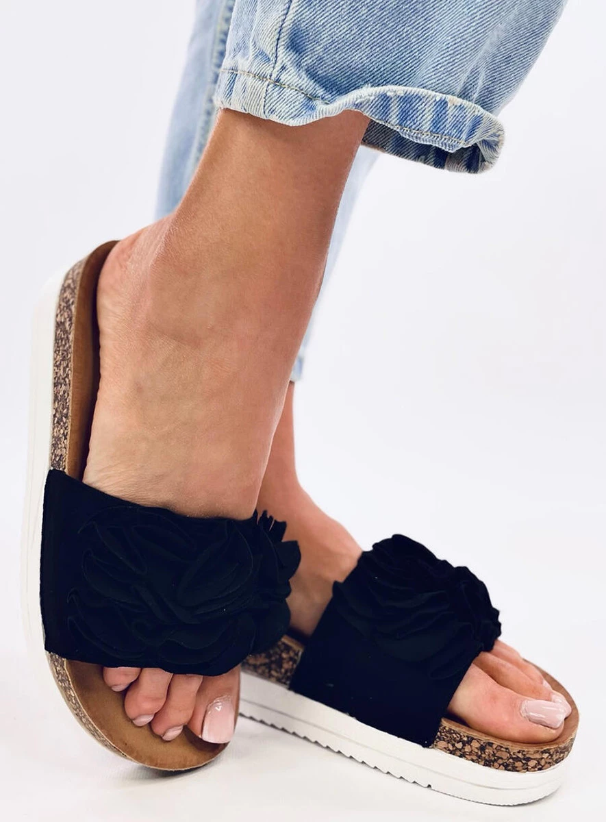 Klapki damskie na wysokiej podeszwie - 4 cm. Są wyjątkowe dzięki kwiecistej aplikacji, która na pewno skradnie Wasze serca : ) Profilowana wkładka wewnętrzna sprawi, że zechcesz zabrać je na każdy wakacyjny spacer : ) Materiał zewnętrzny – zamsz ekologiczny.