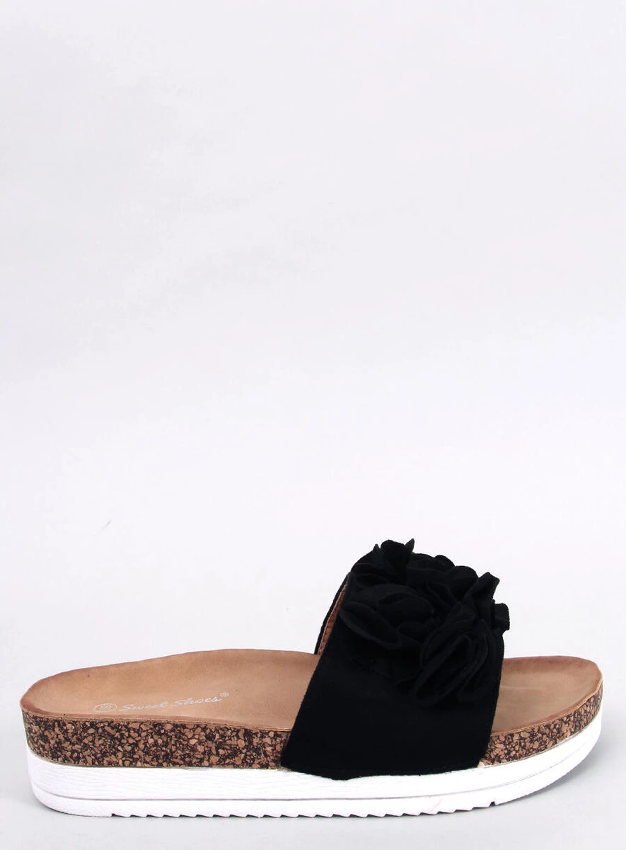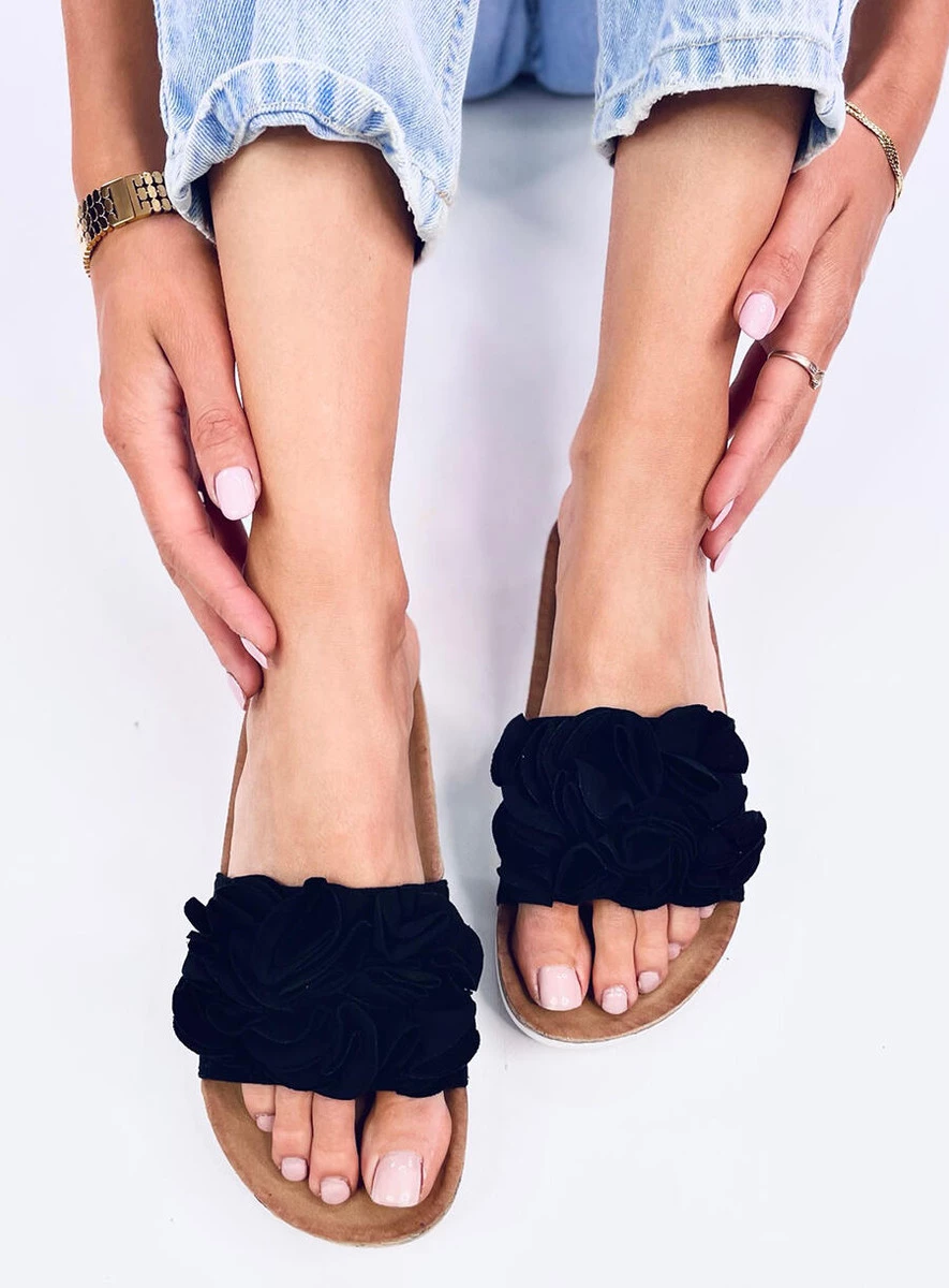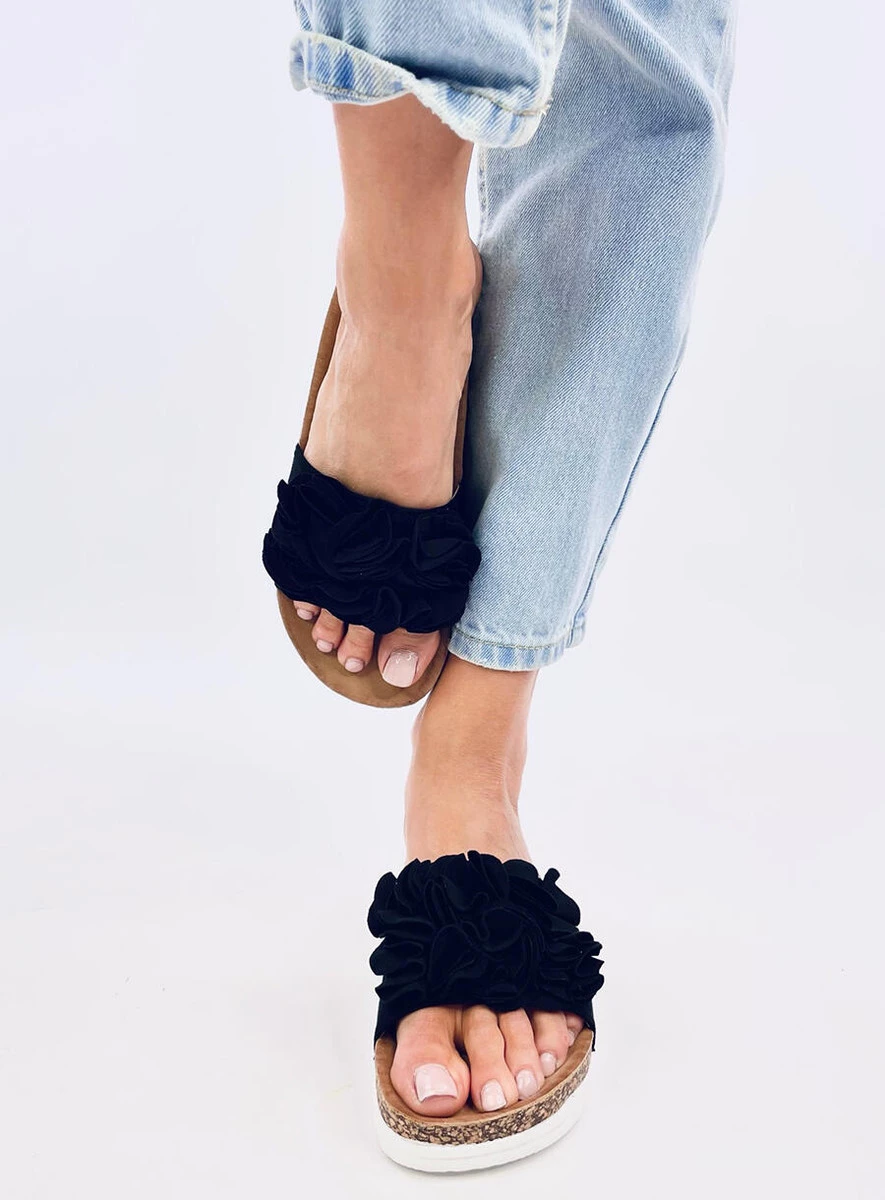 Klapki damskie na wysokiej podeszwie - 4 cm. Są wyjątkowe dzięki kwiecistej aplikacji, która na pewno skradnie Wasze serca : ) Profilowana wkładka wewnętrzna sprawi, że zechcesz zabrać je na każdy wakacyjny spacer : ) Materiał zewnętrzny – zamsz ekologiczny.