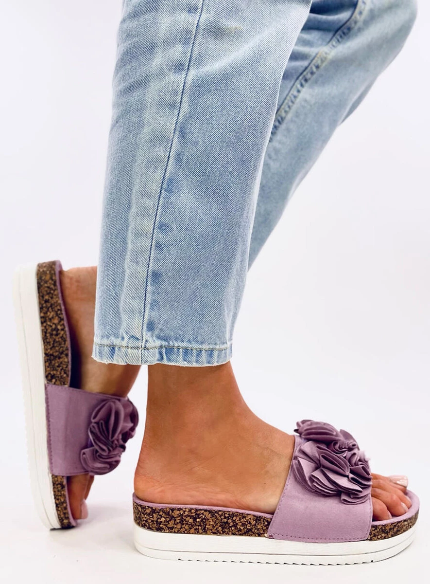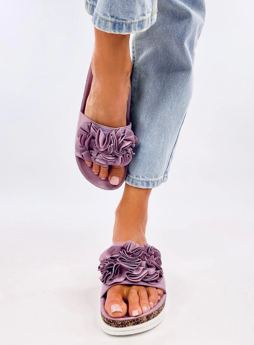 Klapki damskie na wysokiej podeszwie - 4 cm. Są wyjątkowe dzięki kwiecistej aplikacji, która na pewno skradnie Wasze serca : ) Profilowana wkładka wewnętrzna sprawi, że zechcesz zabrać je na każdy wakacyjny spacer : ) Materiał zewnętrzny – zamsz ekologiczny.